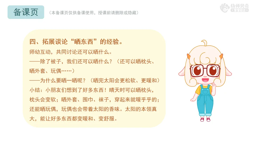 小结:小朋友们想到了好多东西!晴天时可以晒枕头,枕头会变软;晒外套、围巾、袜子,穿起来就暖乎乎的;还能晒玩偶,玩偶也会带着太阳的香味。太阳的本领真大,能让好多东西都变暖和、变舒服。