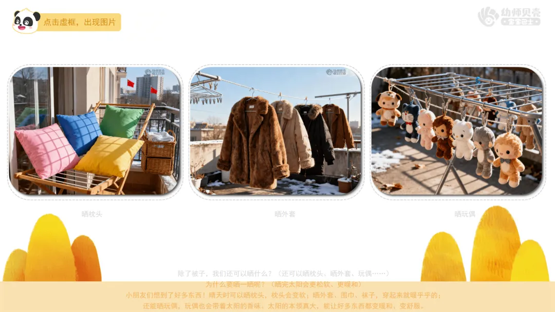 ——除了被子,我们还可以晒什么?(还可以晒枕头、晒外套、玩偶……)