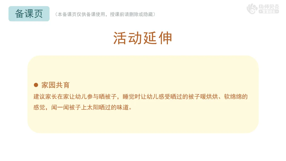 建议家长在家让幼儿参与晒被子,睡觉时让幼儿感受晒过的被子暖烘烘、软绵绵的感觉,闻一闻被子上太阳晒过的味道。