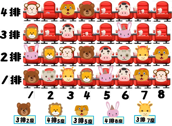 师:“其实呀,这些小动物坐在电影院的第一排,我们可以说得更清楚一点——小狮子坐在第一排的第几个座位?第1排第10座坐的是谁?”(引导幼儿完整重复“第1排第X座”,强调“排”的含义,为两维坐标学习铺垫)