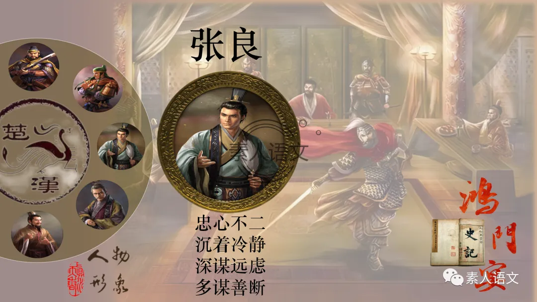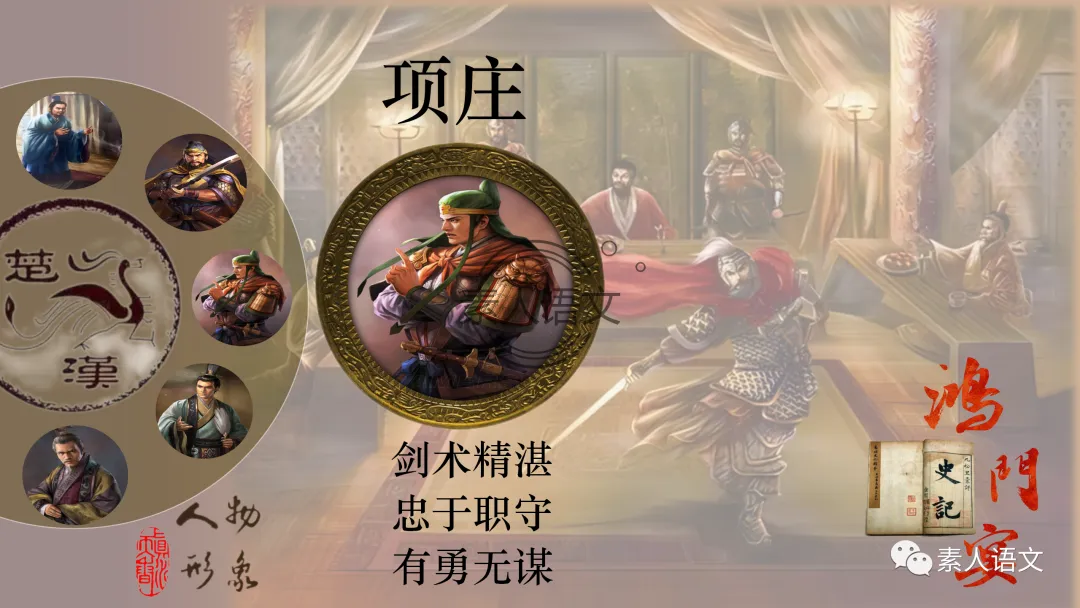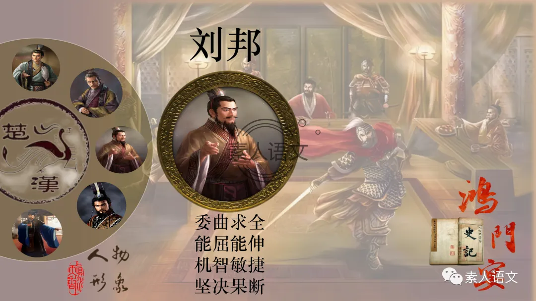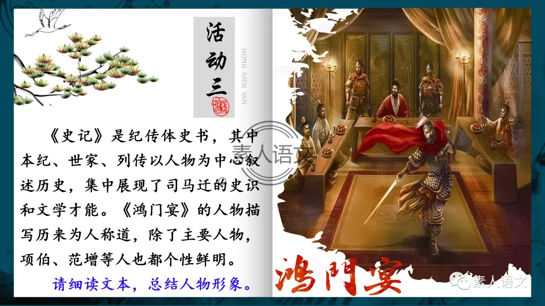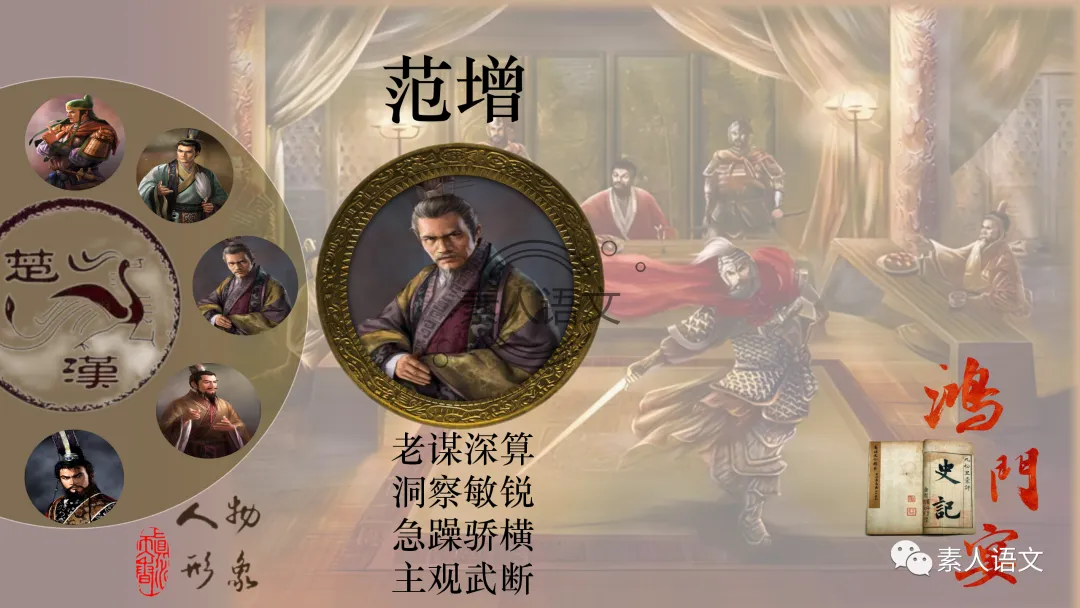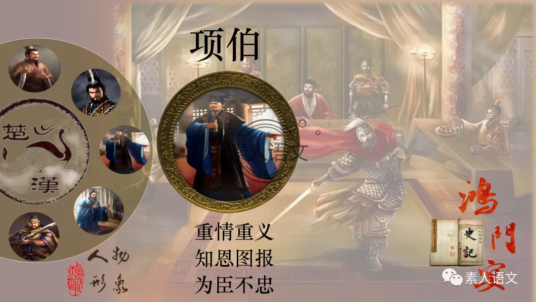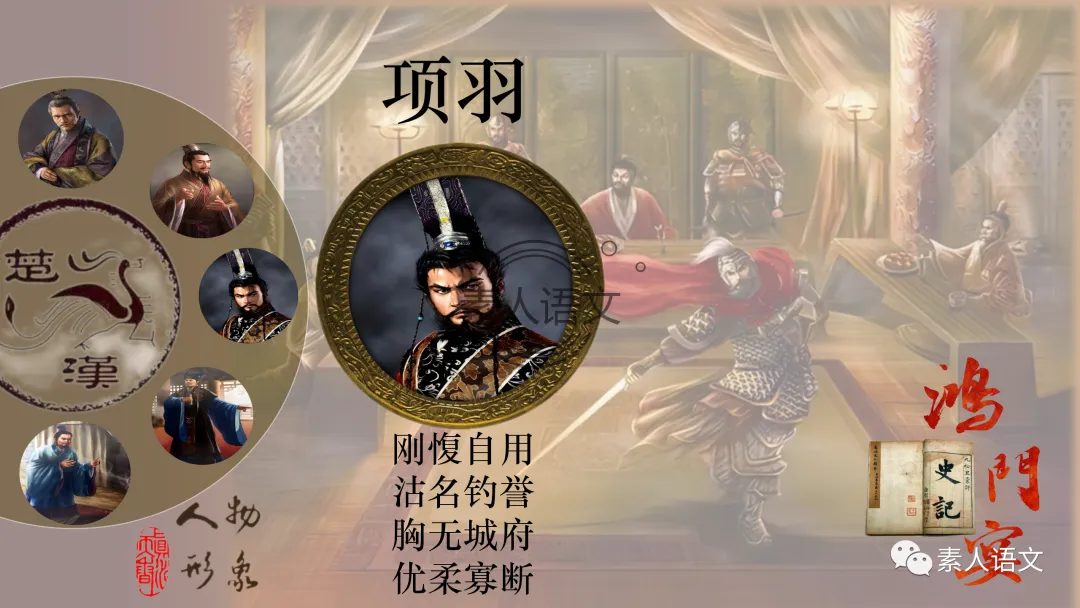 三、《史记》是纪传体史书,其中本纪、世家、列传以人物为中心叙述历史,集中展现了司马迁的史识和文学才能。《鸿门宴》的人物描写历来为人称道,除了主要人物,项伯、范增等人也都个性鲜明。请细读文本,总结人物形象。