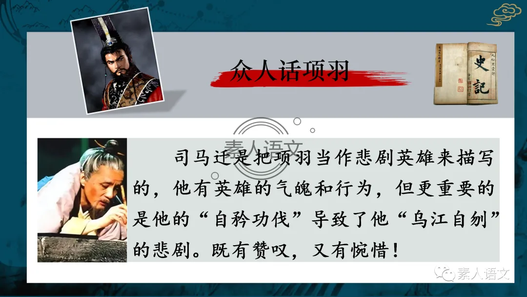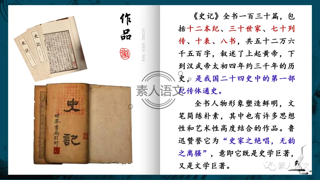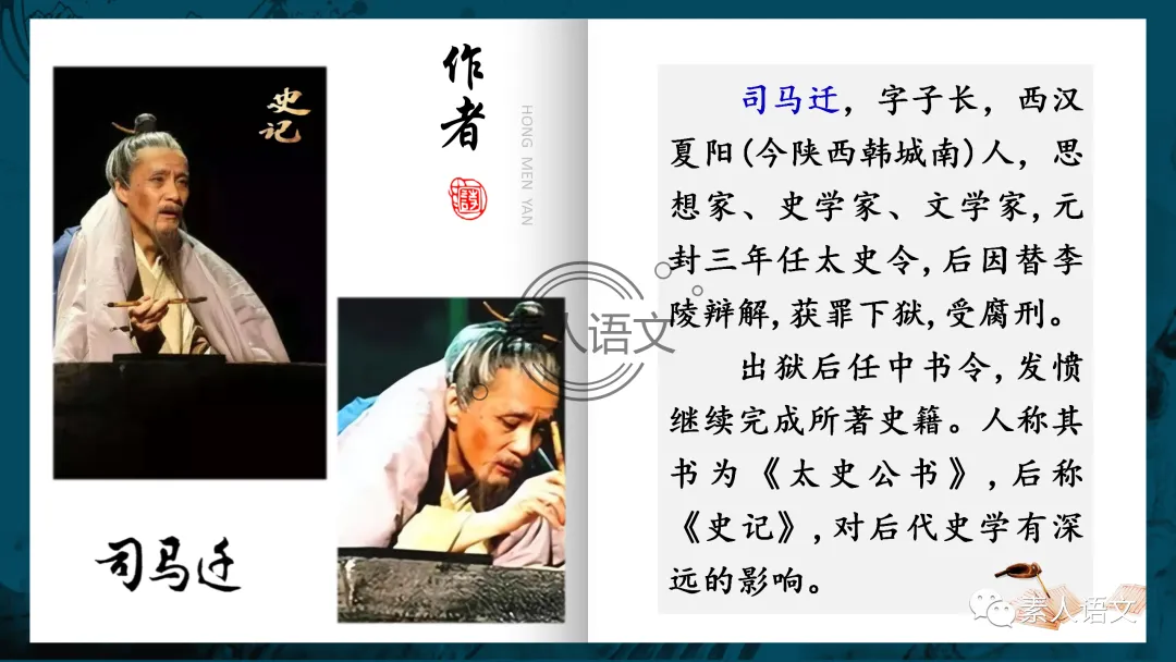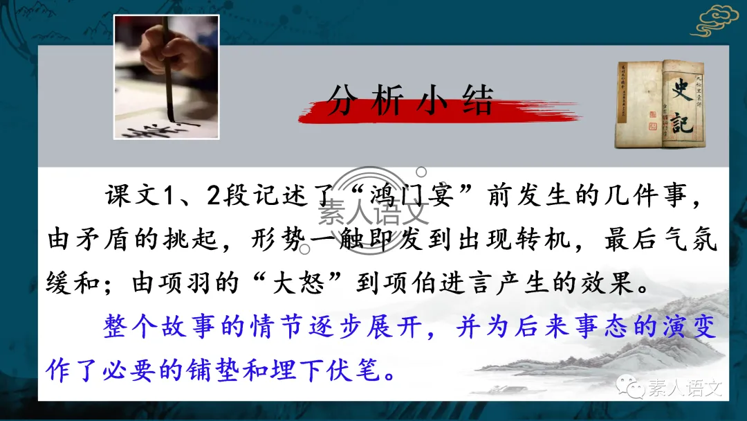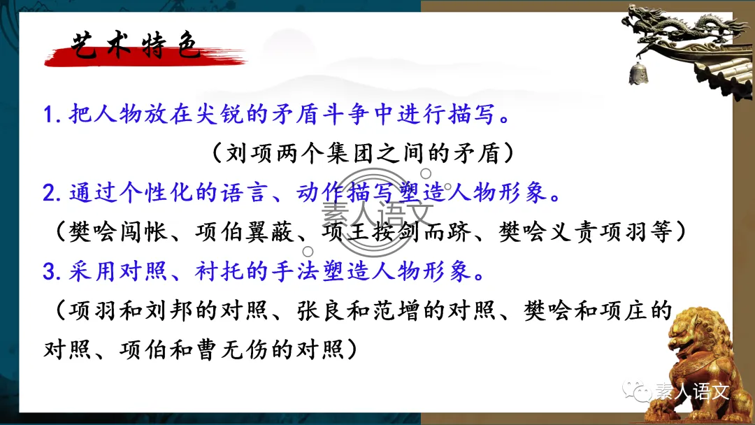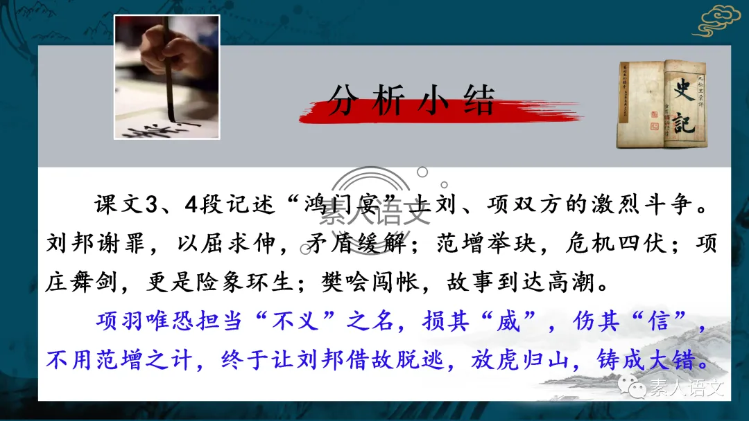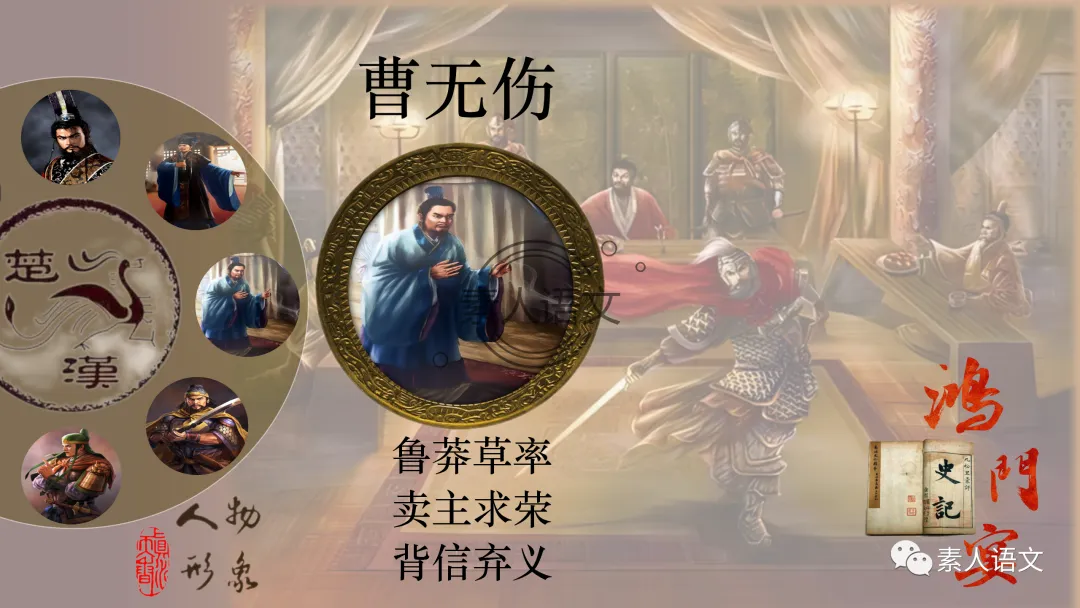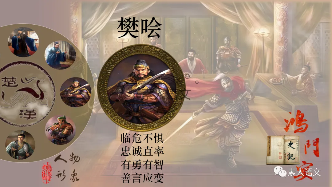 三、《史记》是纪传体史书,其中本纪、世家、列传以人物为中心叙述历史,集中展现了司马迁的史识和文学才能。《鸿门宴》的人物描写历来为人称道,除了主要人物,项伯、范增等人也都个性鲜明。请细读文本,总结人物形象。