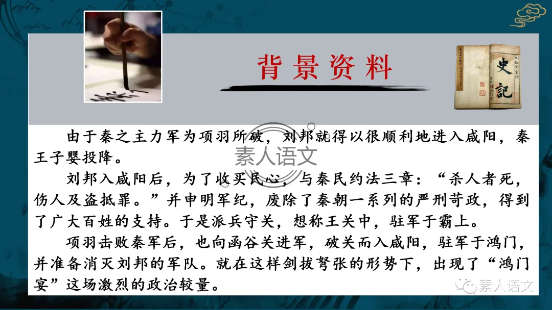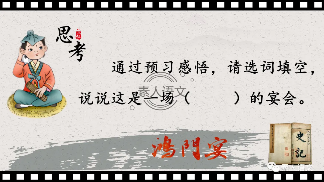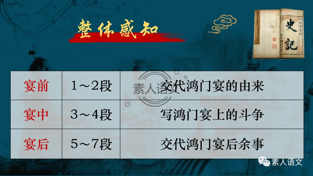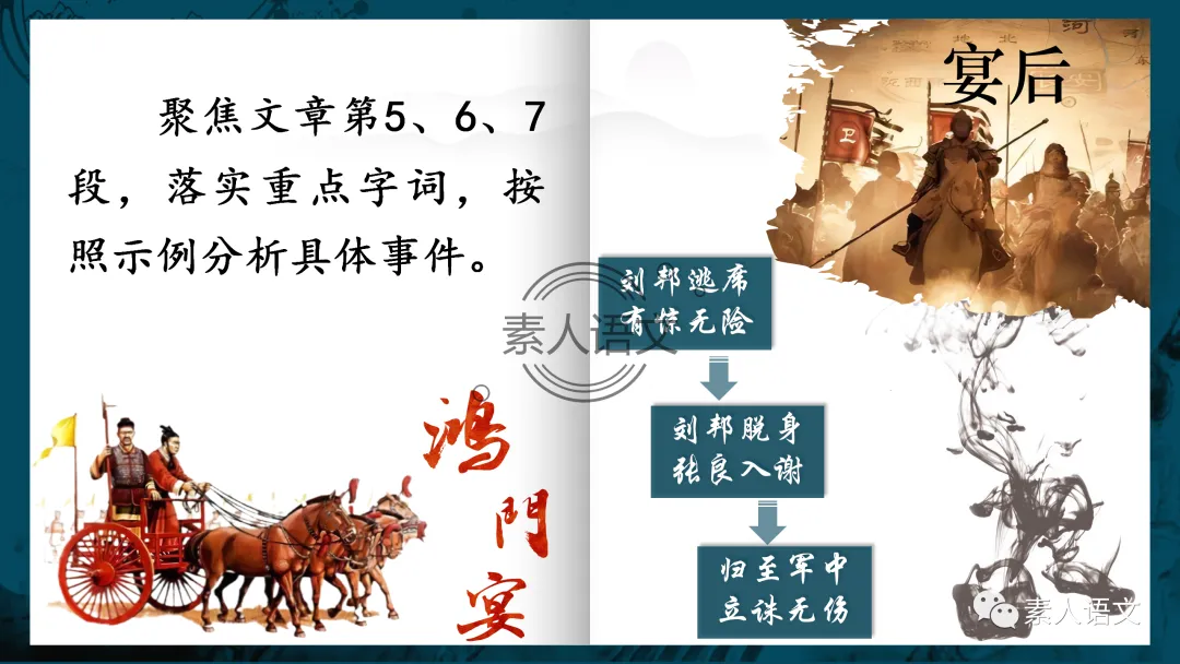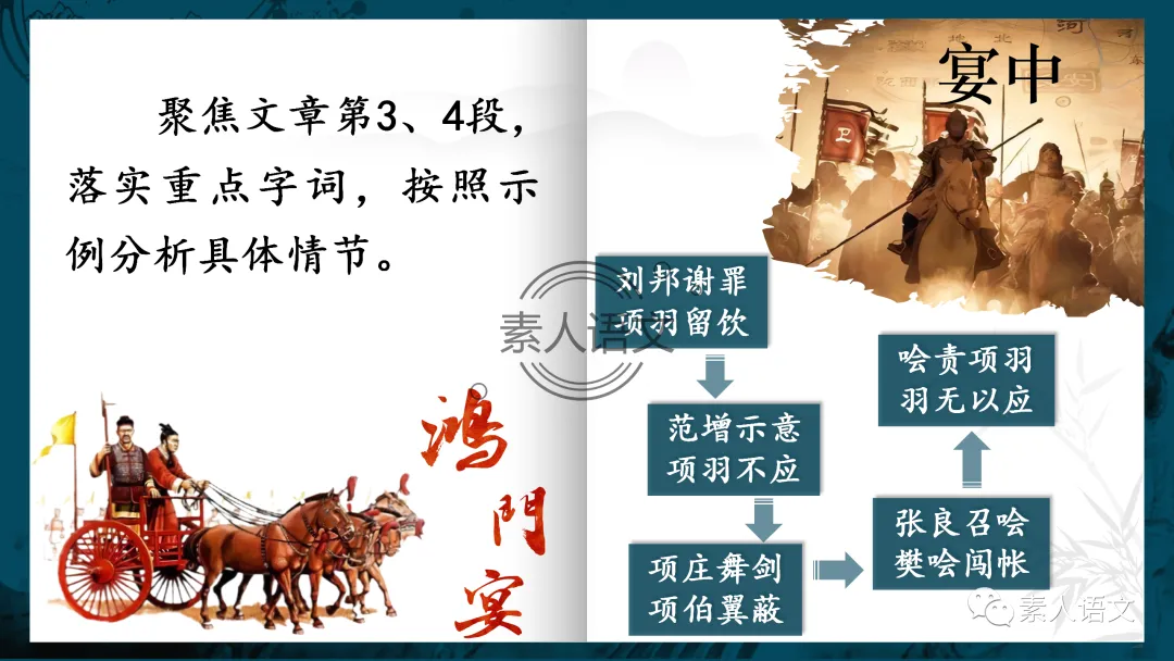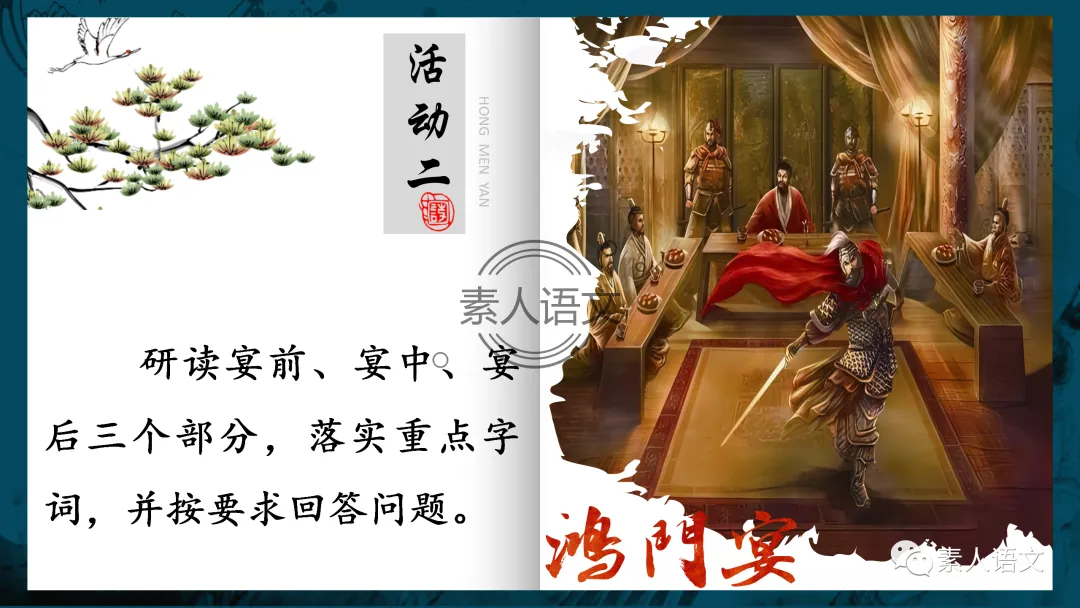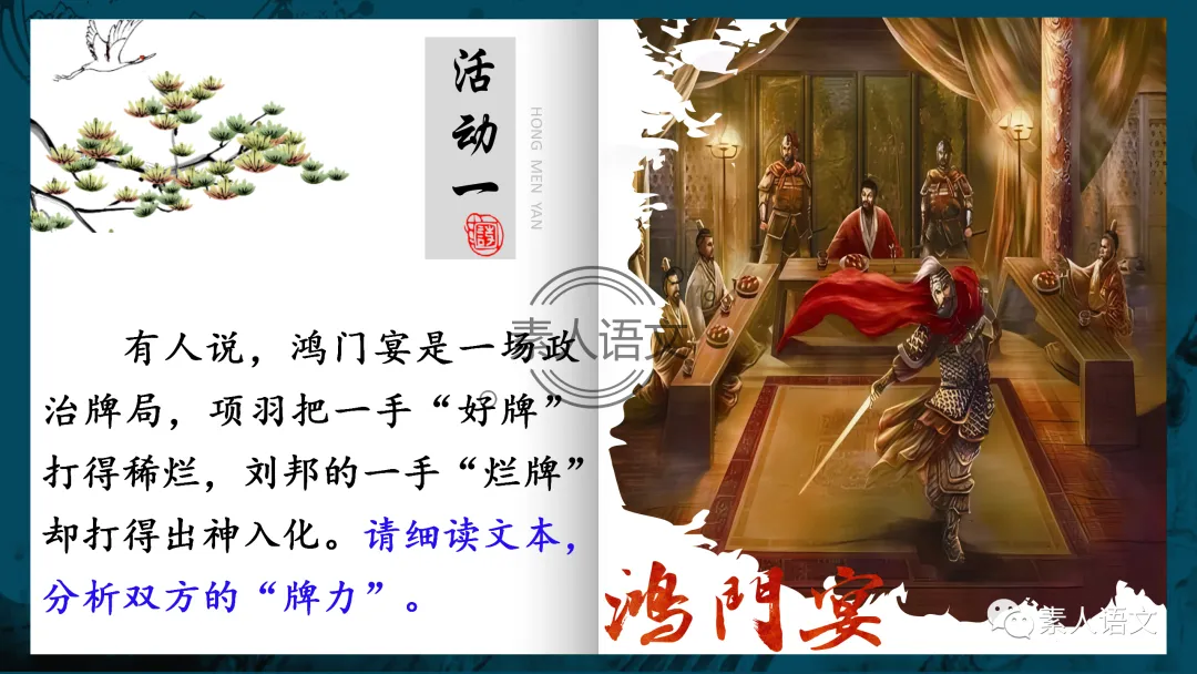小伙伴们好,今天推出的课件是《鸿门宴》。本课进行的是常态课设计,分三个部分进行教学,共设计三个活动。