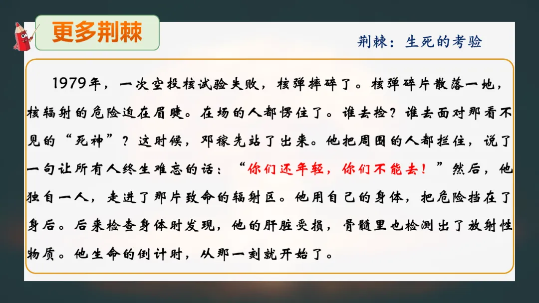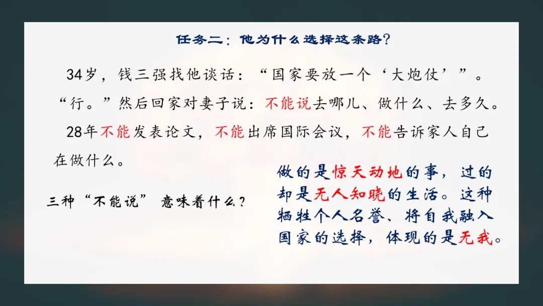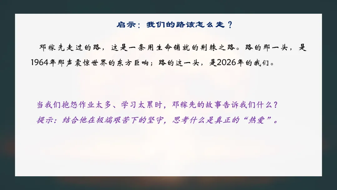品味关键语句与补充资料,感受邓稼先在内忧外患中坚守的艰辛,思考其对当代青年人生选择的启示意义。