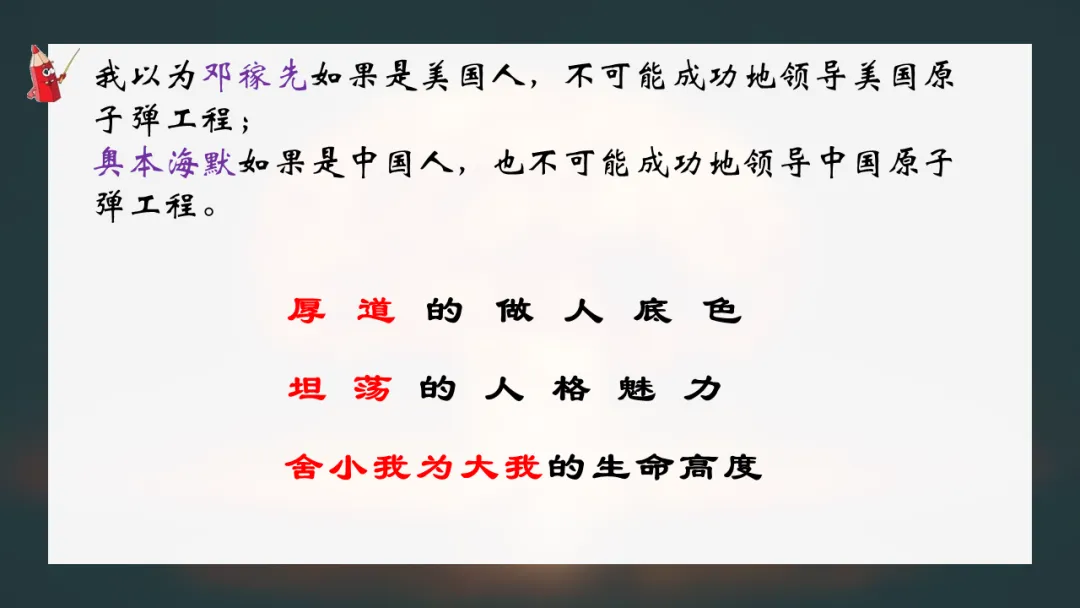结合社会背景与性格分析,理解邓稼先做出人生选择的多重原因,体会其“纯”与“朴”的精神特质。