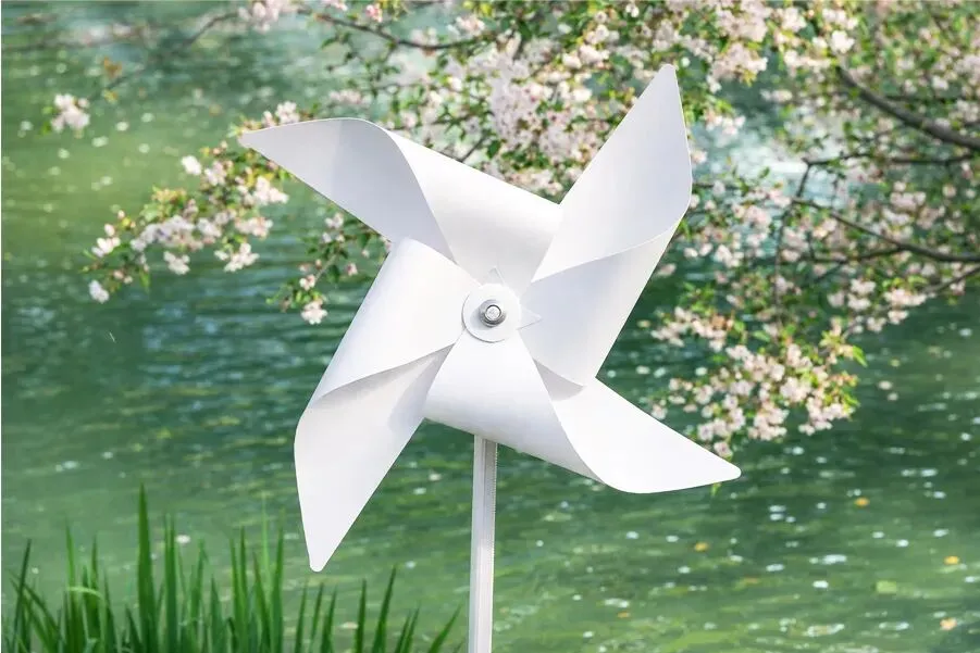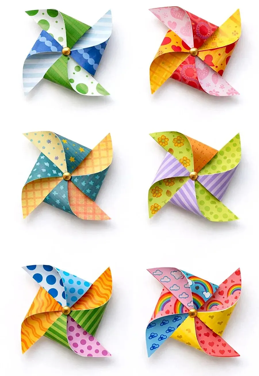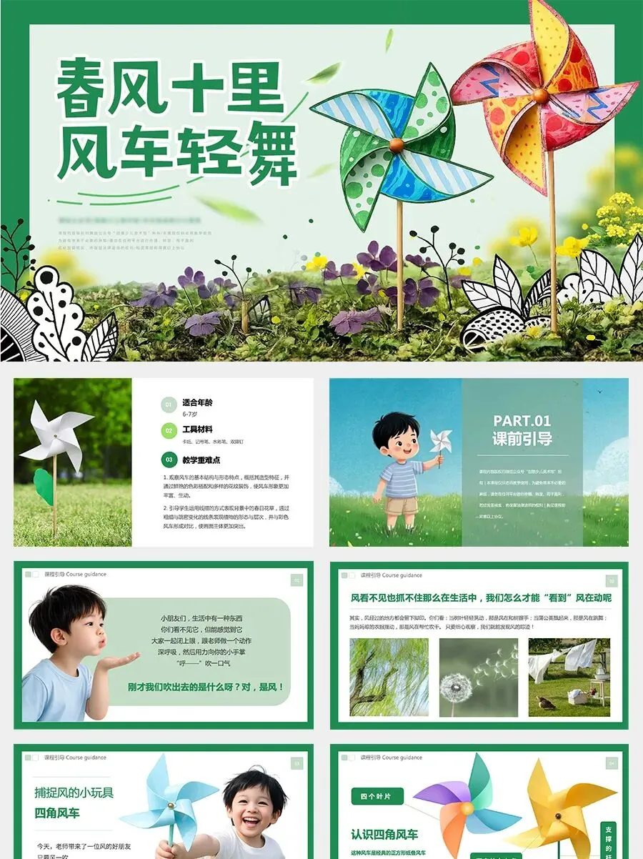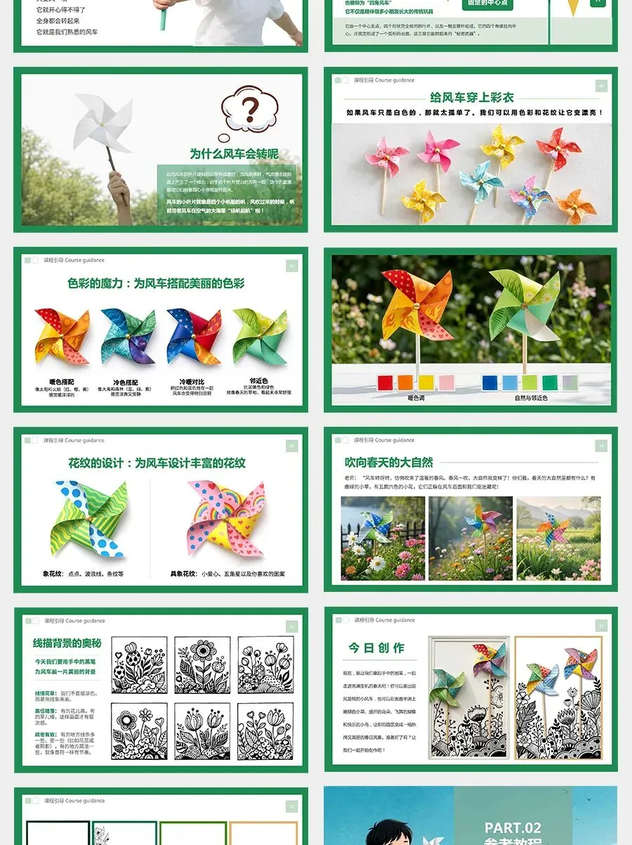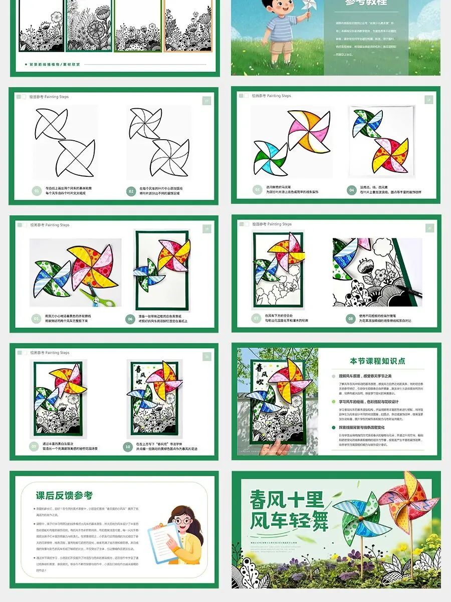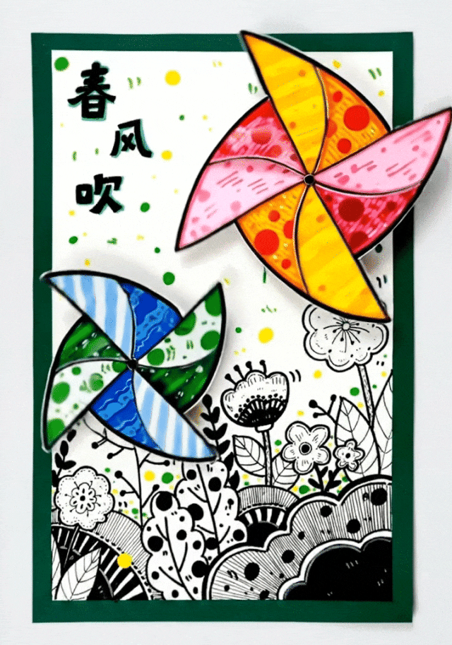 没错,就是可爱的小风车!这种风车是经典的正方形纸叠风车,也叫做“四角风车”,是许多小朋友童年里最熟悉的传统小玩具。它通常用彩色的纸折叠而成,四个尖尖的角围在一起,中间用一根小小的轴固定在木棒上。当风吹来的时候,风车的四个叶片就像小翅膀一样开始旋转,越转越快,发出轻轻的“呼呼”声。你们听,春风一吹,大地妈妈就悄悄换上了新衣裳:小草变绿了,花朵开放了,小鸟在枝头快乐地唱歌,蝴蝶也在花丛里轻轻飞舞。快来找一找,春天的大自然里,还藏着哪些美丽的宝贝呢?