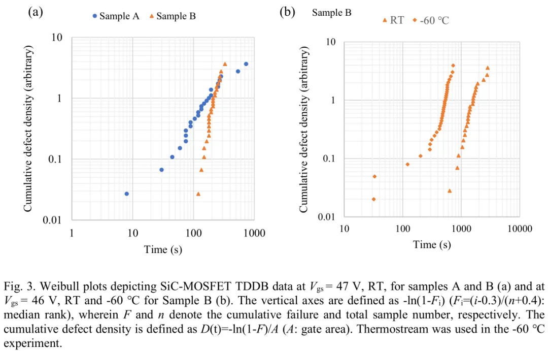 2、本文对比了两款商用SiC MOSFET器件在偏压温度不稳定性(BTI)、经时介质击穿(TDDB)两方面的可靠性;