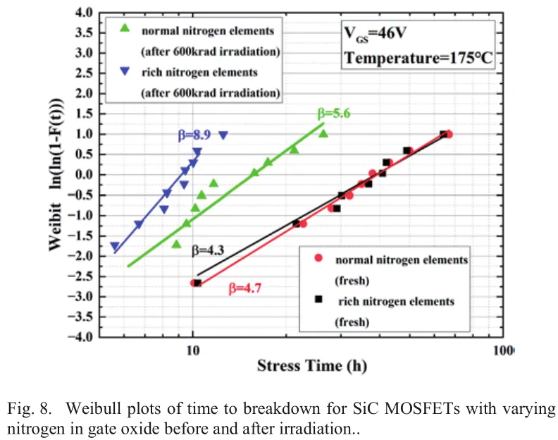 3、富氮设计不影响辐照前的栅氧化层寿命(辐照前不同氮含量器件的β值相近),但富氮设计加剧了辐照后栅氧寿命退化(辐照后样品β值显著增大)。富氮设计尽管可以降低Dᵢt,但也引入了空穴陷阱;