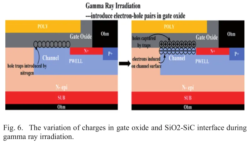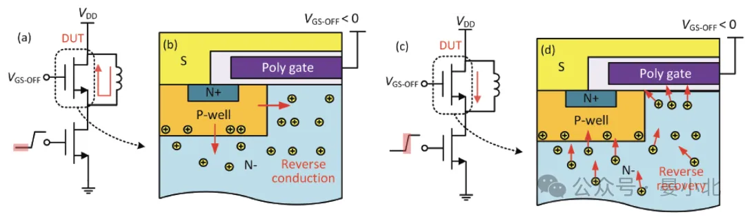 2、当体二极管导通时,大量空穴会从P阱注入JFET区,结合负栅压作用,这些空穴可能被驱至栅氧化层附近;这些热空穴导致MOS界面产生正电荷俘获,使缺陷产生,进而导致Vth负向漂移;
