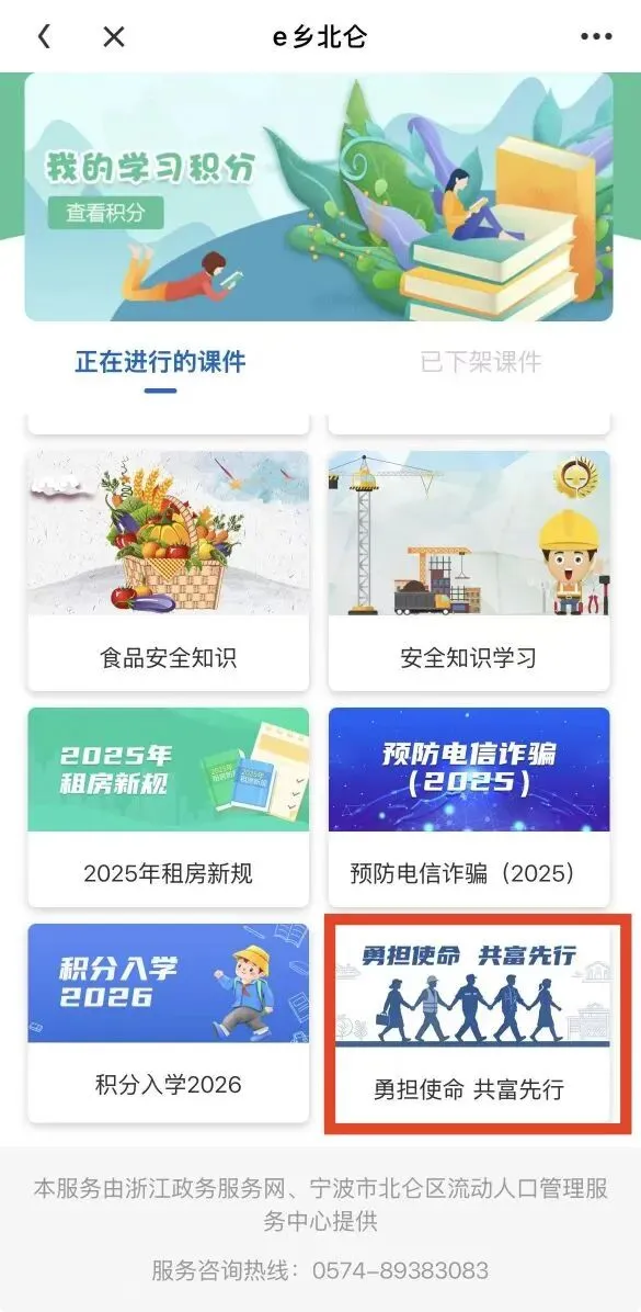 近些年,生活在北仑的每一天,我们都能感受到这座城市的变化:道路更畅通了、学校更近了、环境更美了。而这些变化,都能在每年的政府工作报告看到。近期,两会刚刚结束,2026年是“十五五”规划的开局之年,是宁波市提升城市能级的紧要关头,也是北仑在新的历史起点上整装待发的关键一年。因此,北仑区流动人口管理服务中心在“浙里办”App“积分学习”版块中设置了一期“勇担使命 共富先行”的学习课件,通过学习答题可以奖励0.5积分。课件于3月20日上线,敬请关注哦!