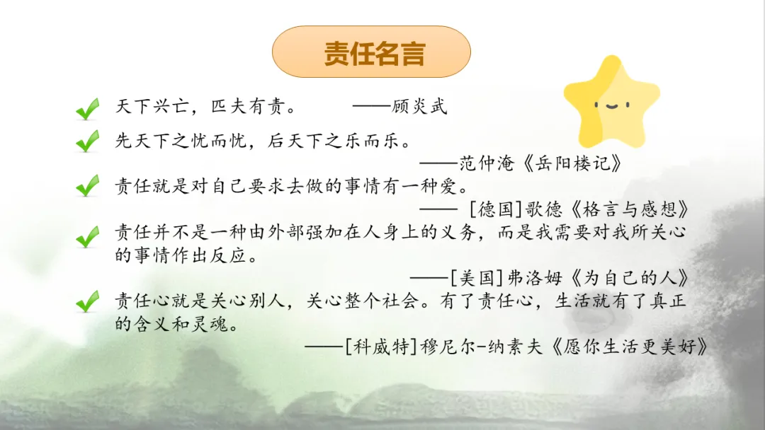 古往今来,先贤们用言行诠释着责任的重量。顾炎武说“天下兴亡,匹夫有责”;范仲淹写“先天下之忧而忧,后天下之乐而乐”;歌德认为“责任就是对自己要求去做的事情有一种爱”。这些都在告诉我们:责任,是生命中不可或缺的底色。