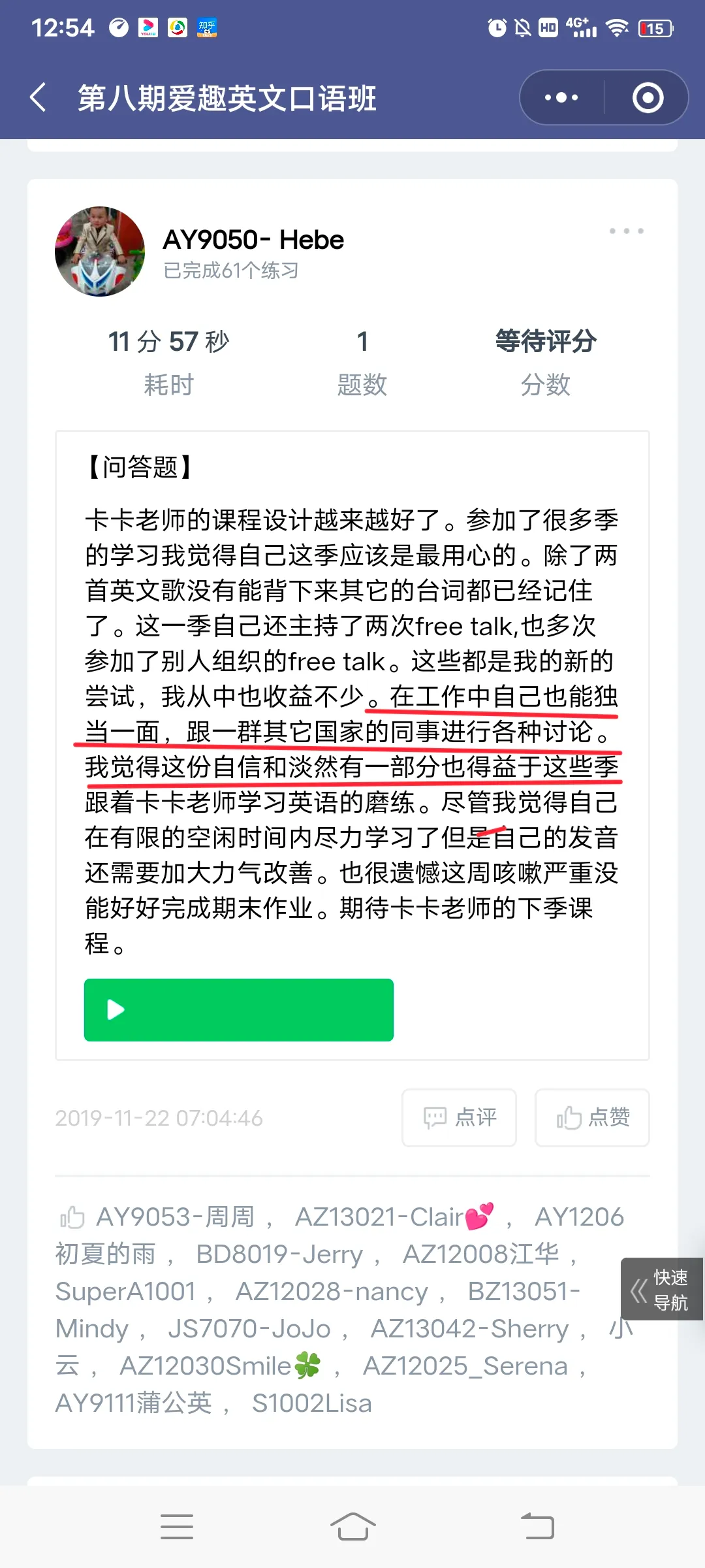 每周的作业中,小伙伴们都会用视频记录自己在英语上的收获;