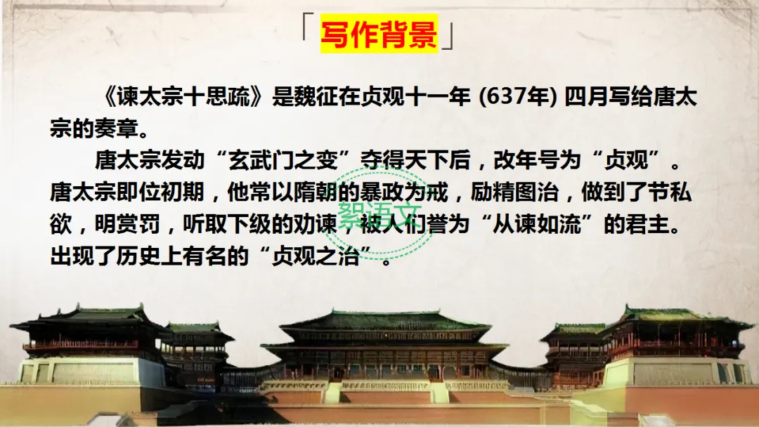 《谏太宗十思疏》是魏征在贞观十一年(637年) 四月写给唐太宗的奏章。唐太宗发动“玄武门之变”夺得天下后,改年号为“贞观”。即位初期,他以隋朝暴政为戒,励精图治,节私欲、明赏罚、善纳谏,开创“贞观之治”。