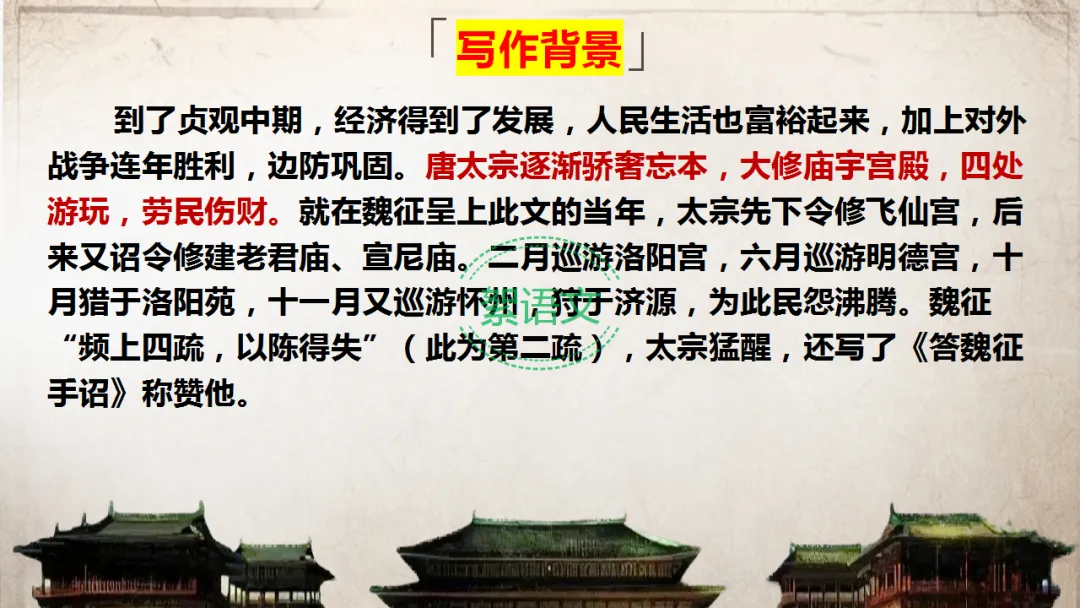 至贞观中期,经济发展、百姓富裕、边防巩固,唐太宗逐渐骄奢忘本,大修庙宇宫殿、四处巡游狩猎,劳民伤财,民怨沸腾。魏征“频上四疏,以陈得失”,本文为第二疏,太宗读后猛醒,还作《答魏征手诏》称赞他。