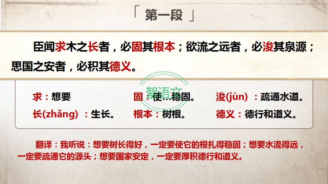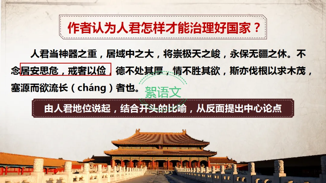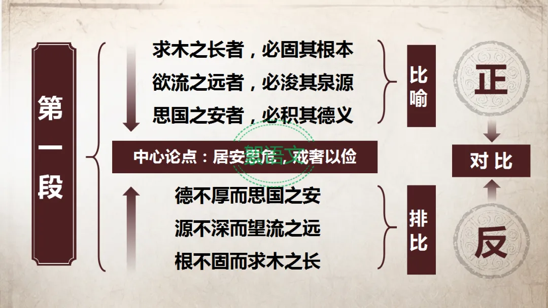 明确:人君居安思危、戒奢以俭,积其德义,方能守好江山;若德不厚、纵私欲,便是“伐根以求木茂,塞源而欲流长”,无法实现国家安定。(由人君的地位入手,结合比喻从反面提出中心论点:居安思危,戒奢以俭)