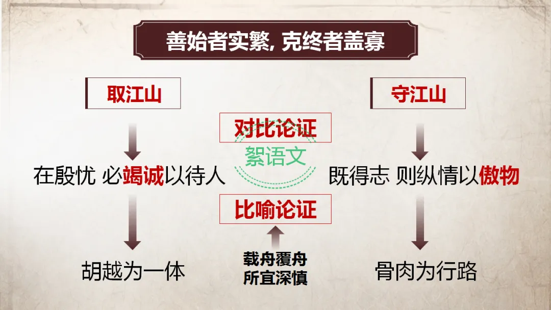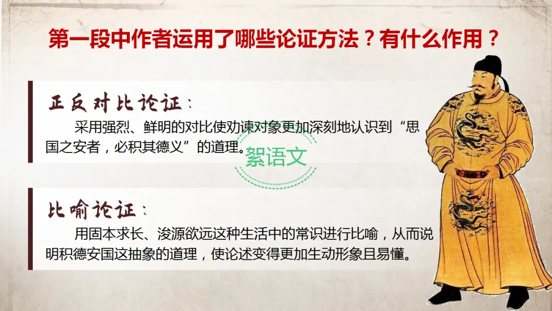 比喻论证:以“求木之长者必固其根本”“欲流之远者必浚其泉源”的生活常识,比喻“思国之安者必积其德义”的治国道理,将抽象的治国理念具象化,生动易懂,让君主易于接受。