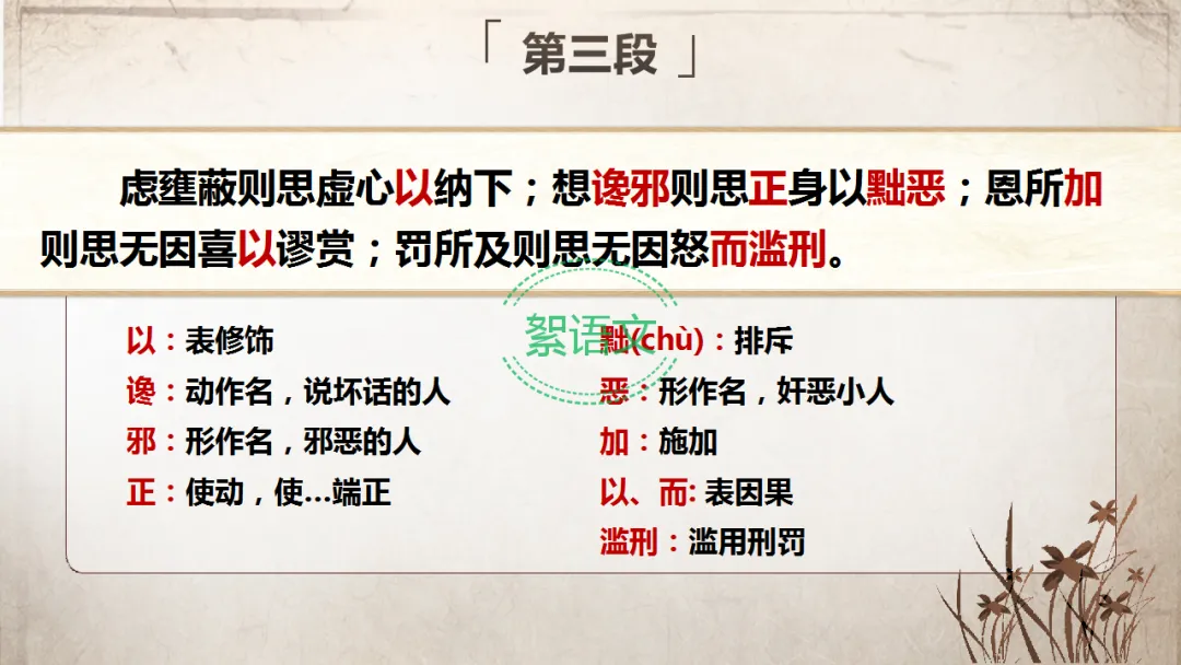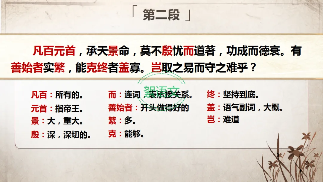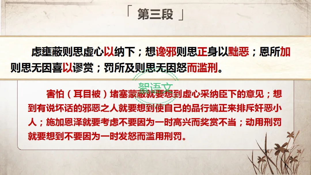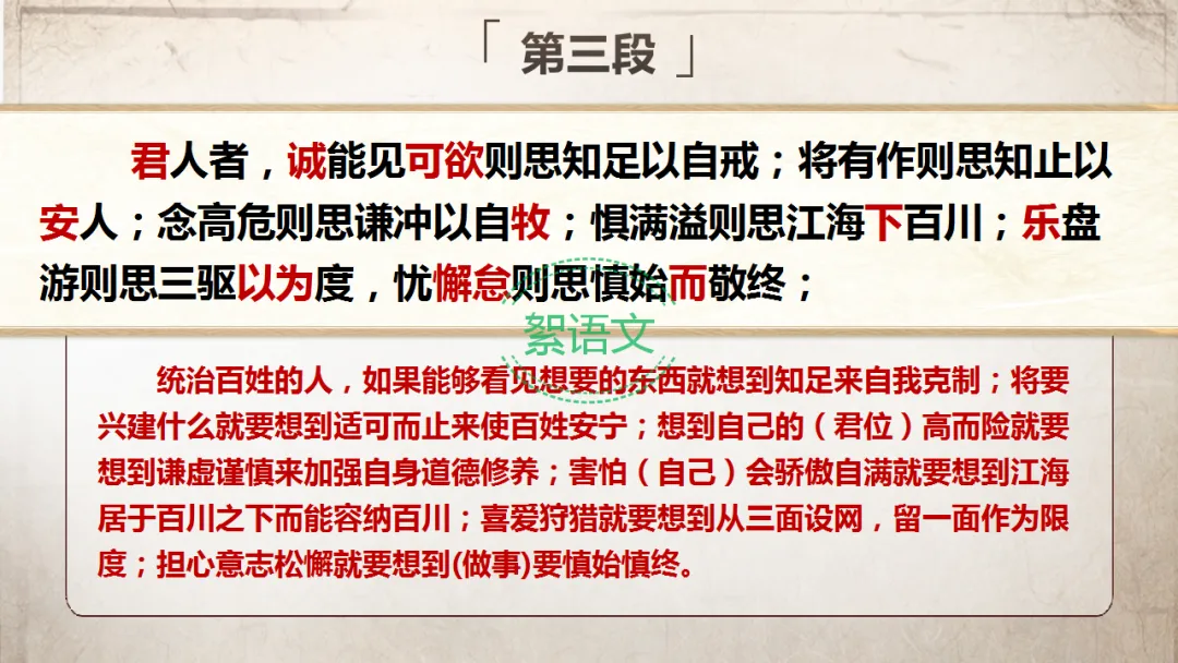 过渡:既然人君治理国家必须“居安思危,积其德义”,那么魏征为何反复强调君主要“思”?“十思”的具体内容又是什么?今天我们继续研读课文第二、三段。