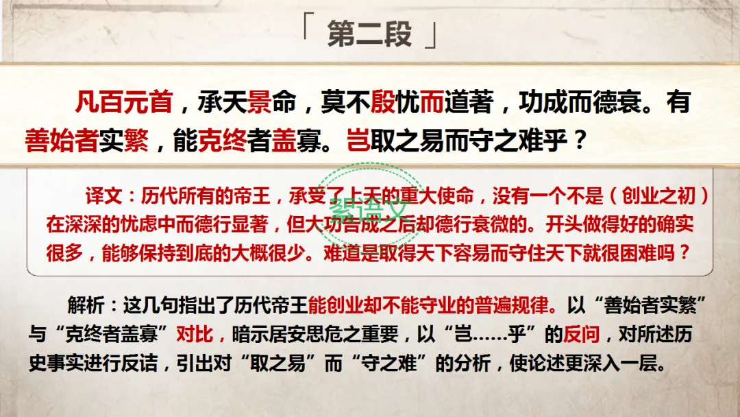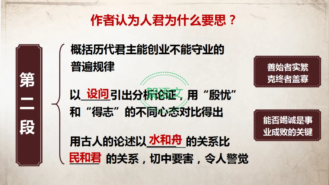 分析问题(第二段):总结历代帝王善始难克终的历史教训,强调民心重要性,回答“人君为什么要思”。