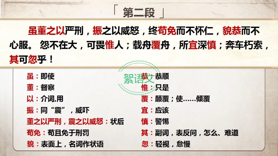 特殊句式:董之以严刑,振之以威怒(状语后置,正常语序为“以严刑董之,以威怒振之”)。