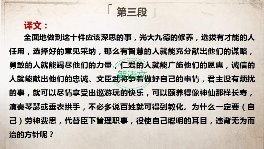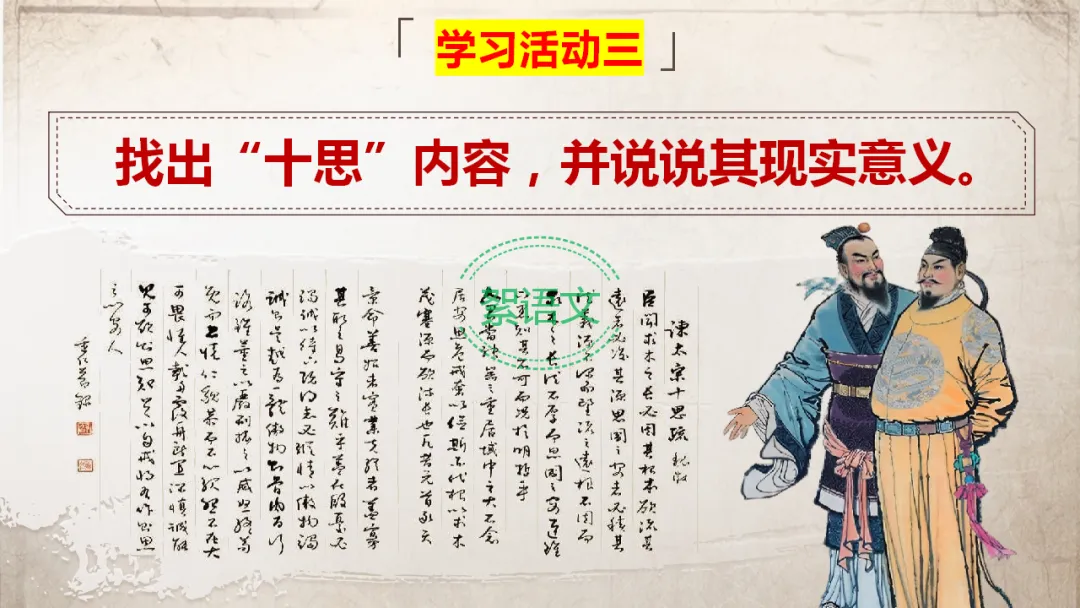 过渡:魏征提出“十思”,并非仅仅要求君主做到这十条,更希望君主通过“十思”实现治国的理想境界。今天我们完成第三段的研读,赏析魏征的劝谏艺术,探讨“十思”的现实意义。