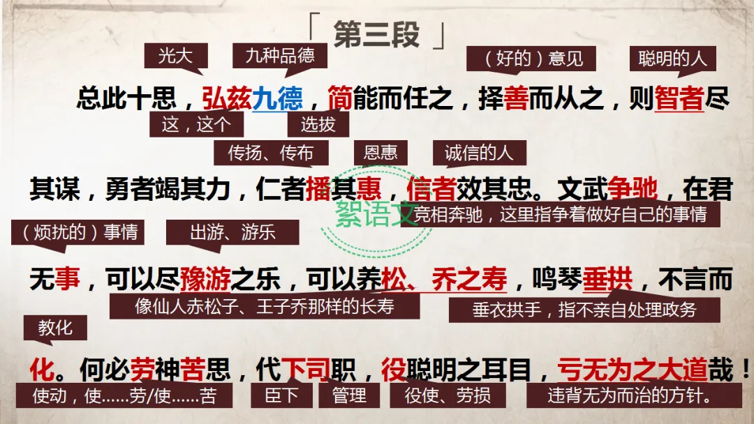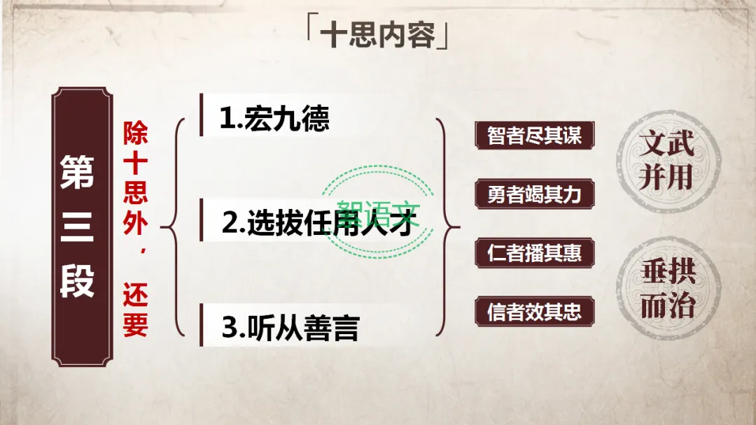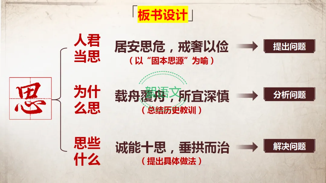 解决问题(第三段):提出“十思”的具体内容,给出用人纳谏的建议,阐述“思后之效”,实现垂拱而治。