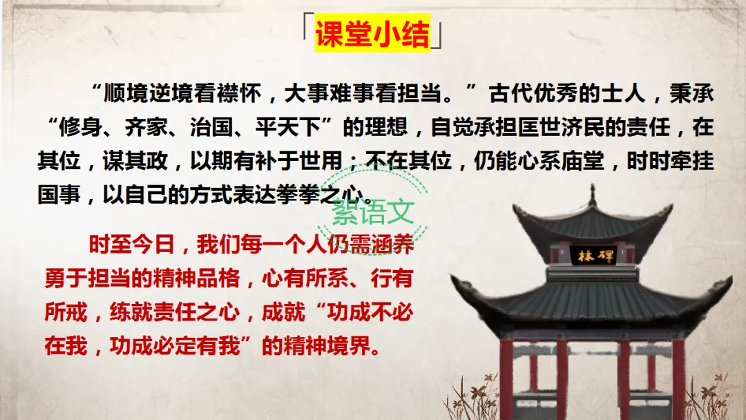 本节课我们完成了第三段的研读,理解了“十思”后的治国建议和“垂拱而治”的效果。赏析了魏征层层递进、情理兼备的劝谏艺术,体会到其敢于直谏、忠心为国的精神品格。同时深入探讨了“十思”的历史作用和现实意义,明确其对个人成长和社会治理的借鉴价值。最后梳理了全文论证结构,完成了高考考点的巩固训练,并进行了全文背诵指导。