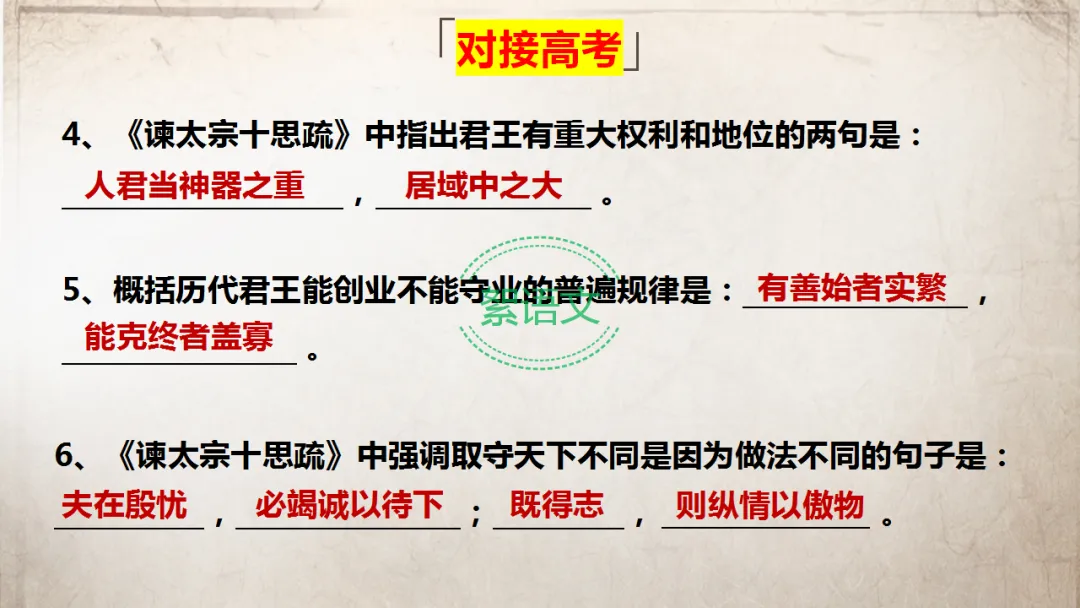 深入探讨“十思”的历史作用和现实借鉴意义,完成全文背诵,巩固高考考点。