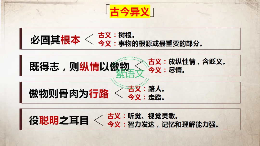 古今异义:既得志,则纵情以傲物(纵情:古义为放纵情感、骄傲,今义为尽情)