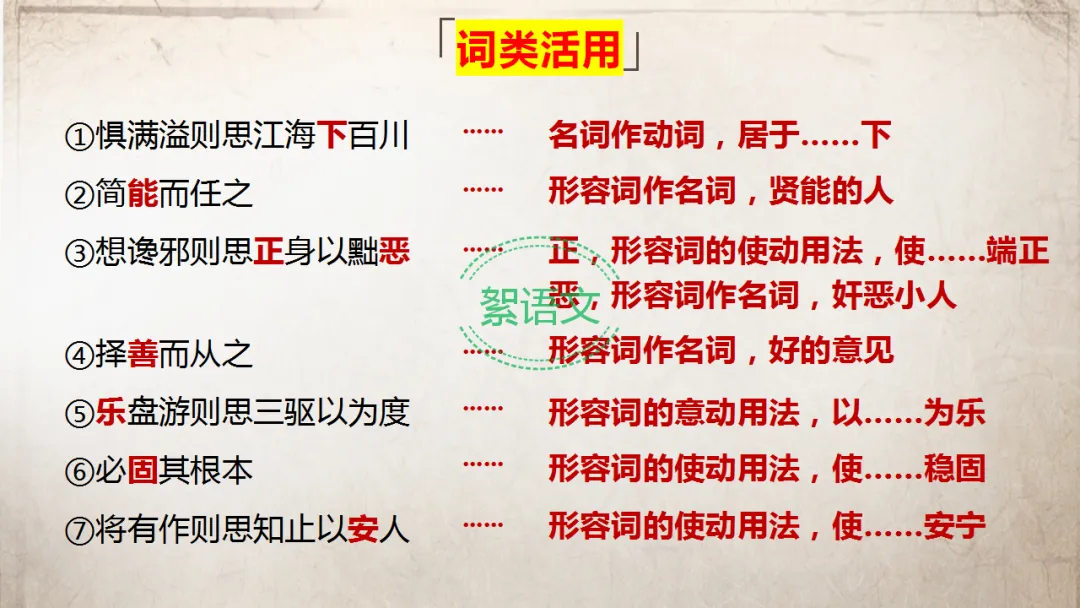 逐句讲解重点文言知识,强调词类活用、古今异义、虚词用法:
