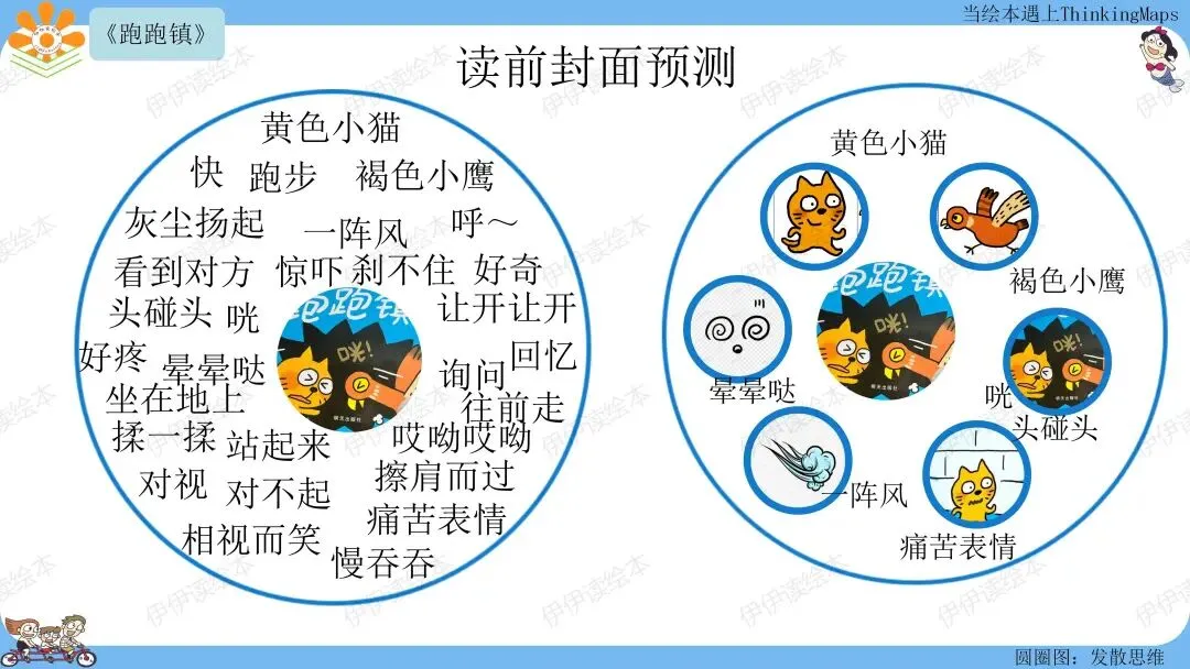 ——《跑跑镇》文字作者是亚东,图画作者是麦克小奎。明天出版社出版。画面上有一只小猫还有一只小鹰,你们猜他们发生了什么事情呢,为什么会咣(guang)一声呢?(引导孩子根据图画内容进行想象,引导表达)。接下来让我们一起去看看吧。