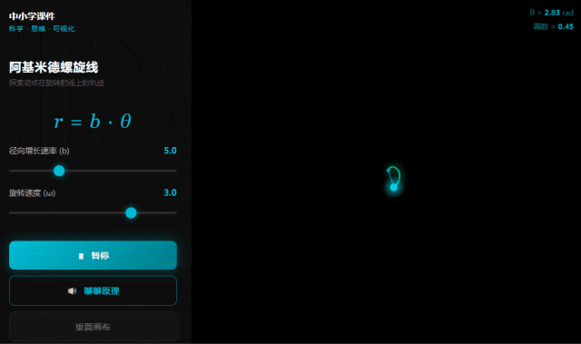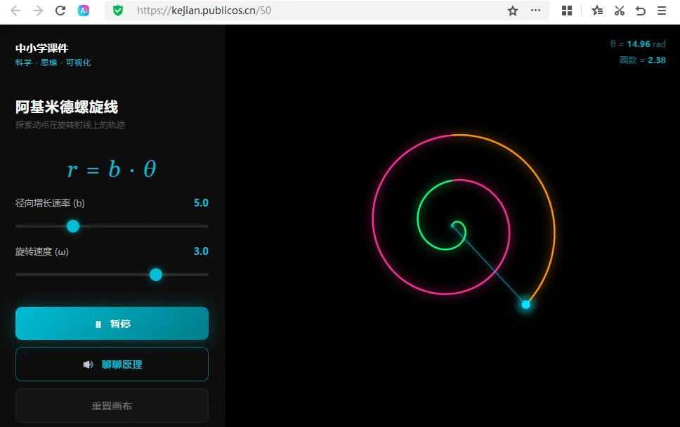 本次全新上线【阿基米德螺旋线】,支持参数控制,通过非常形象生动的方式展示螺旋线的运动轨迹,所见即所得,课件访问地址:https://kejian.publicos.cn/50(复制到浏览器打开)