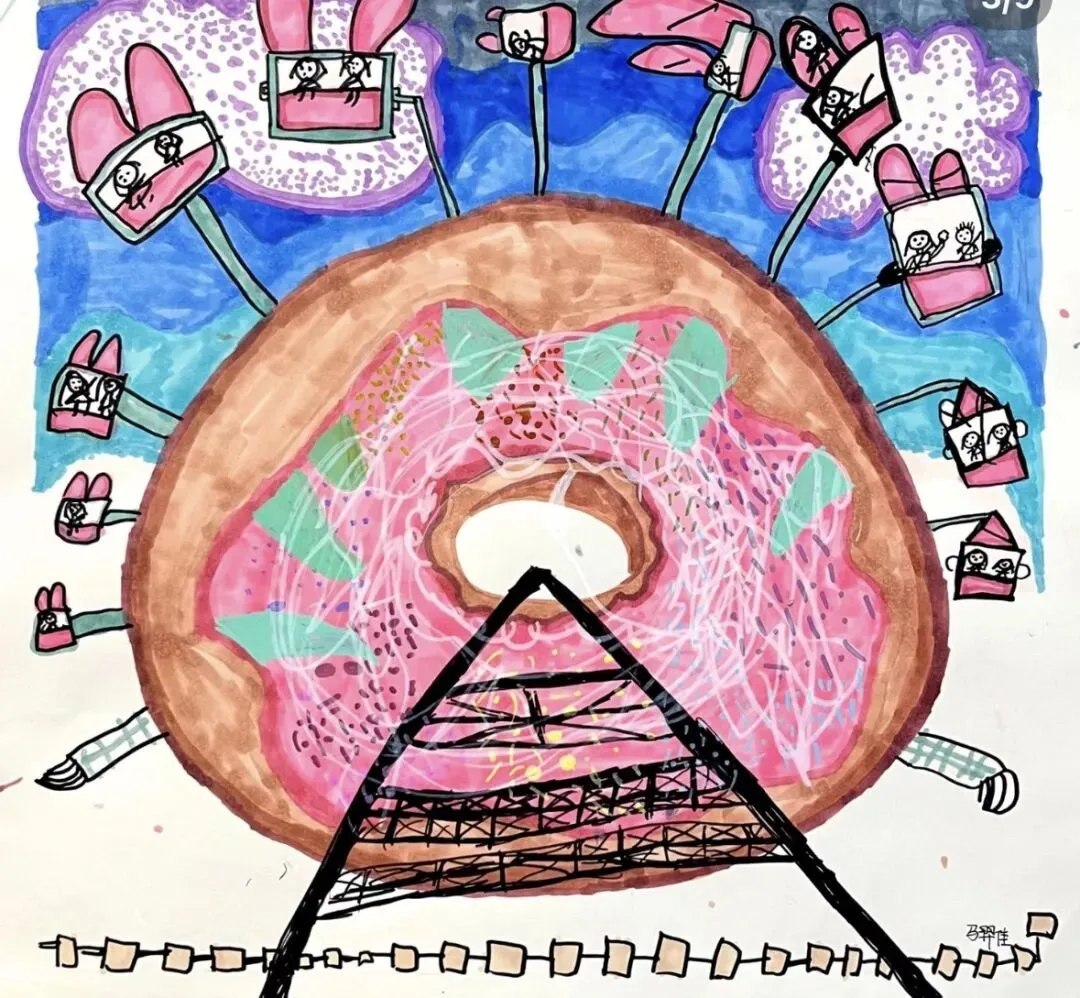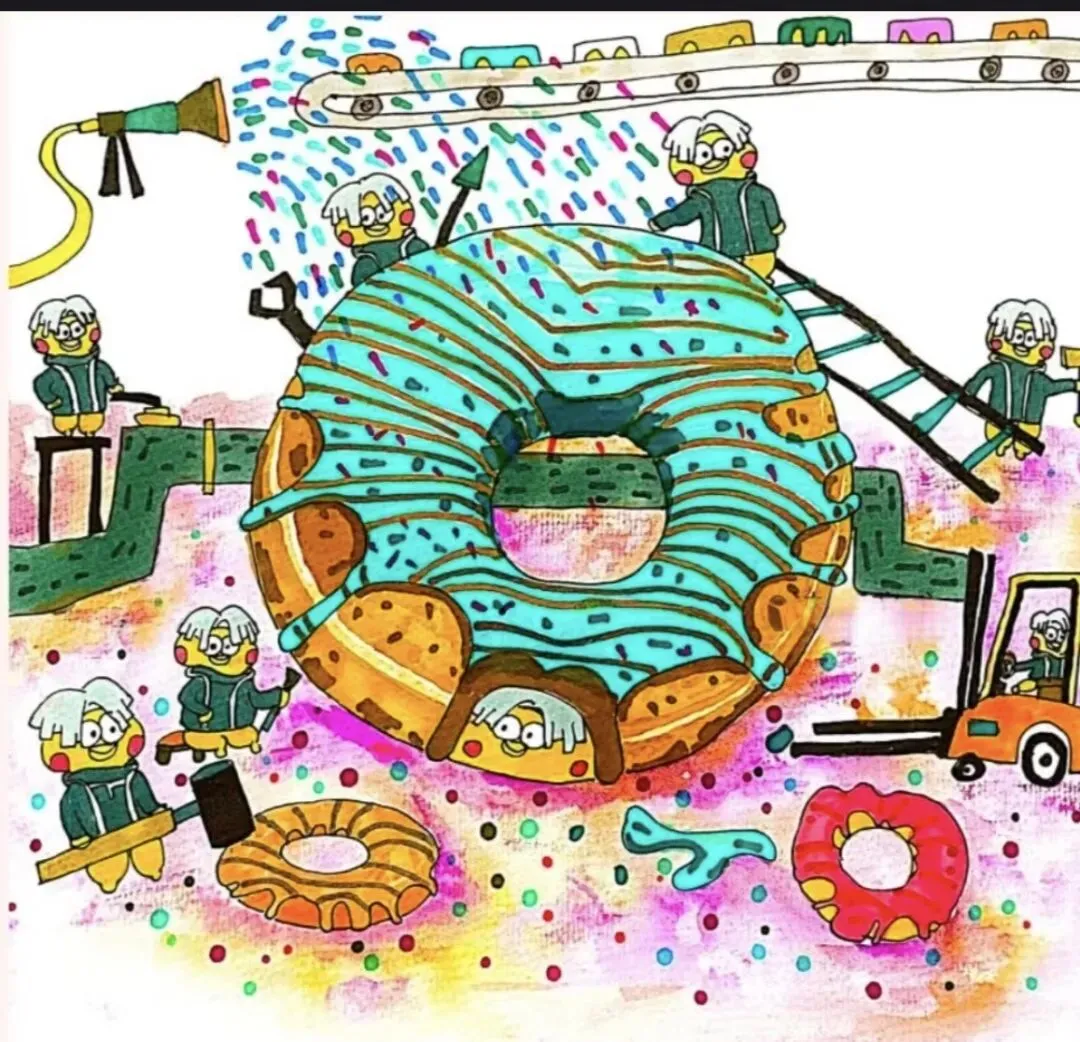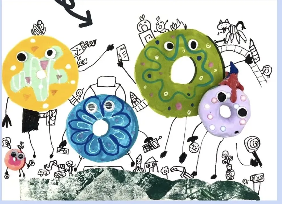 课题立意:以“甜甜圈工厂”为童趣载体,激发孩子对“大与小”“合作与创造”的想象,用夸张造型和丰富色彩表达热闹的工作场景。