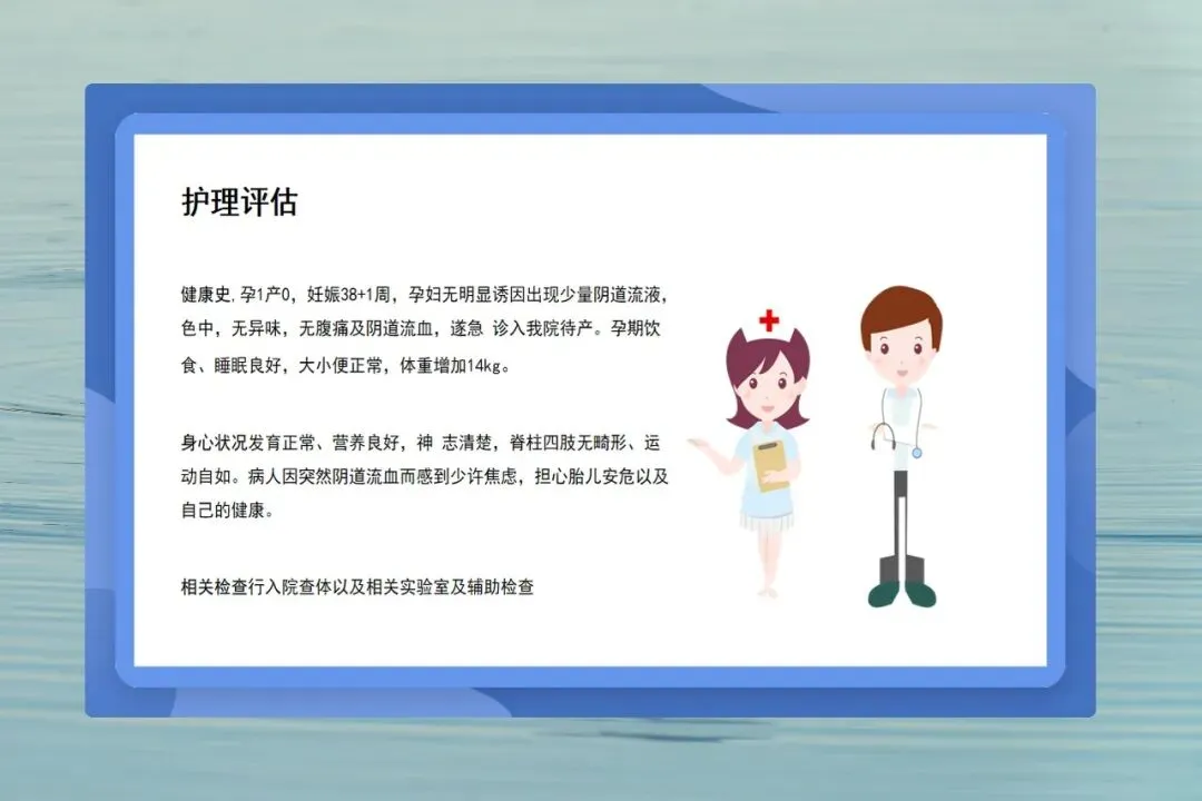 患者,28岁,孕1产0,怀孕38周+1天。那天她无明显诱因突然感觉阴道有少量液体流出,无色无味,没有腹痛也没有出血。她立刻警觉,急诊入院。