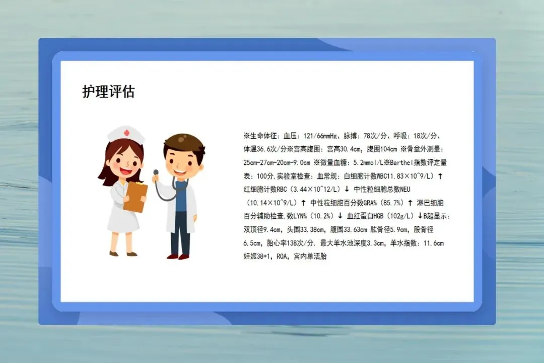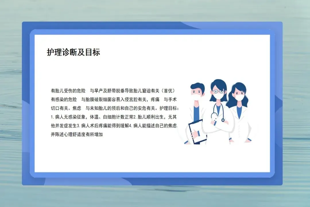 第一个护理问题是“有胎儿受伤的危险”。胎膜破裂后,羊水减少,脐带可能被挤压或脱垂,导致胎儿缺氧。我们的措施是:让产妇绝对卧床休息,以左侧卧位为主,减少翻身和坐起;每1小时监测胎心变化;低流量吸氧预防缺氧;密切观察羊水性状、有无宫缩和阴道流血。如果发现脐带脱垂,随时准备结束分娩。
