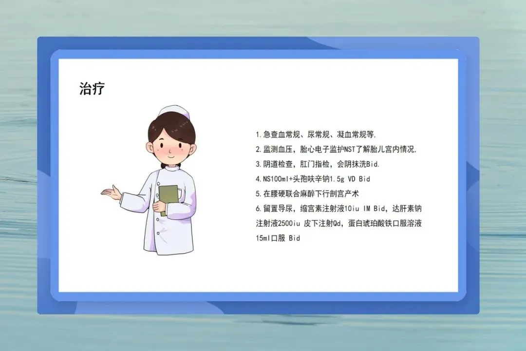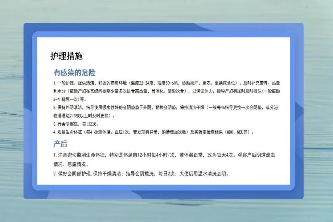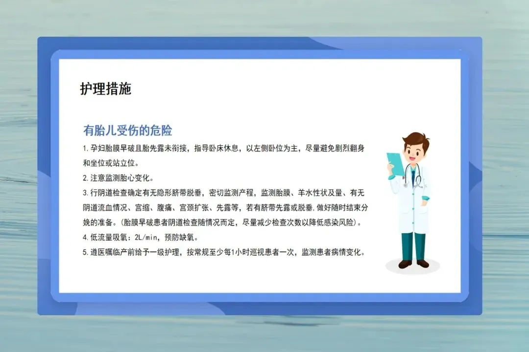 第二个问题是“有感染的危险”。胎膜破裂后,阴道和外界相通,细菌容易上行进入宫腔。护理上要做到:保持外阴清洁干燥,使用吸水性好的会阴垫,每4小时或浸湿后及时更换;每日两次会阴擦洗;每4到6小时测一次体温,密切监测血常规变化。产后继续观察体温、恶露情况,做好会阴护理。