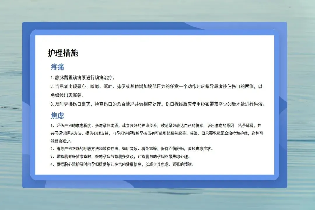 第四个问题是“焦虑”。产妇担心胎儿的安危和自己的健康。护士要多和她沟通,鼓励她表达焦虑,讲解胎膜早破的相关知识,告诉她只要积极配合,风险可控。指导她做深呼吸、听音乐、看杂志放松心情,鼓励家属多陪伴、多交谈。