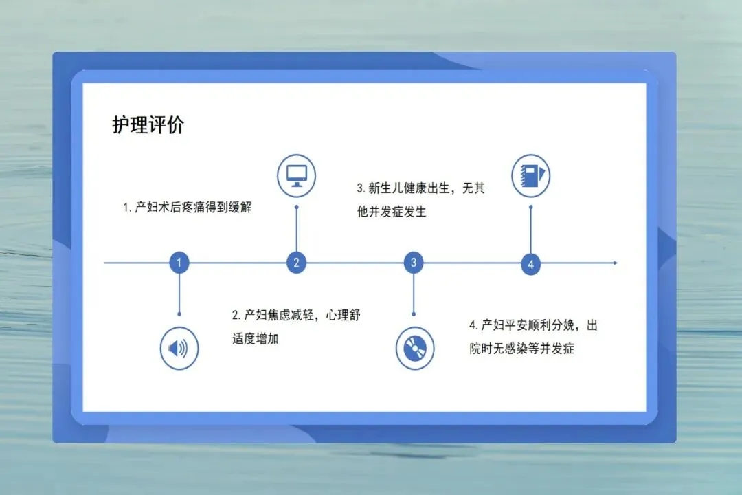 经过精心护理,产妇顺利分娩,新生儿健康,无感染等并发症发生。术后疼痛得到有效控制,焦虑情绪明显缓解,出院时母婴平安。