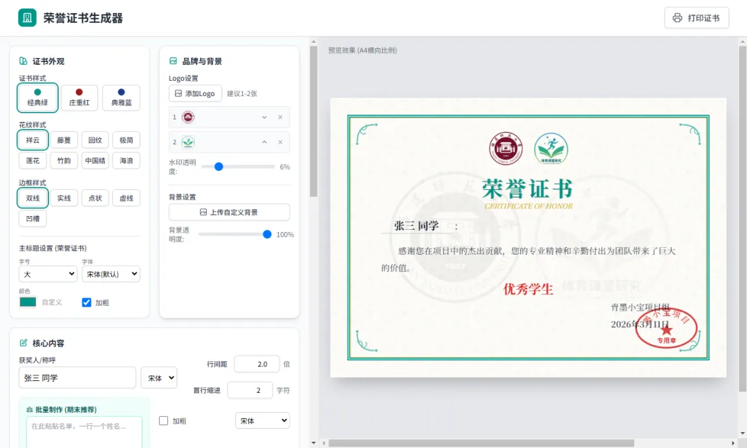 本次全新上线荣誉证书制作工具,支持多种参数控制,所见即所得,支持批量制作和打印,课件访问地址:https://kejian.publicos.cn/26 (复制到浏览器打开)