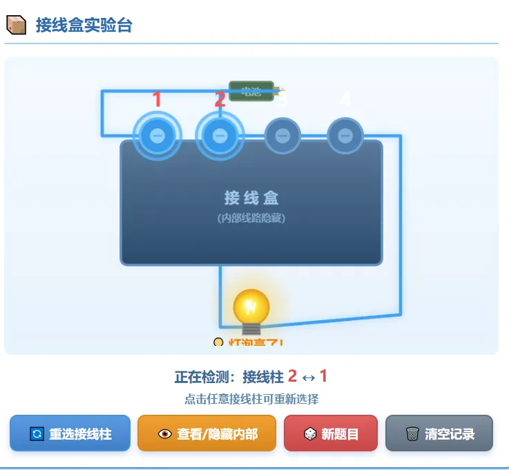 页面上有一个矩形接线盒,盒子上方有1、2、3、4四个接线柱,盒子内部的线路连接学生看不见,是隐藏的,可随机点击变换排布的,可以1234都连接,也可以只是234等。盒子可以点击是否查看内部连接(变透明)