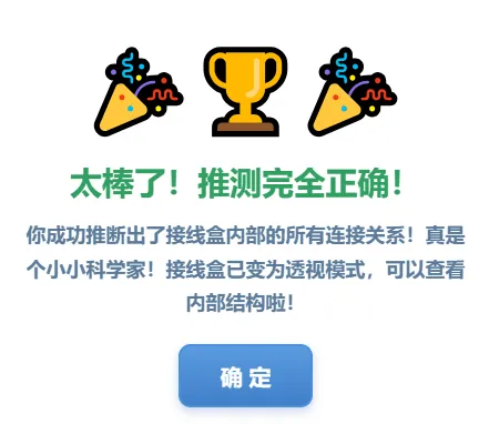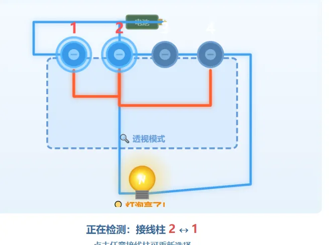 如果答案正确,出现表扬文字、表扬音效、灯泡亮起,接线盒变透明可以看到里面;