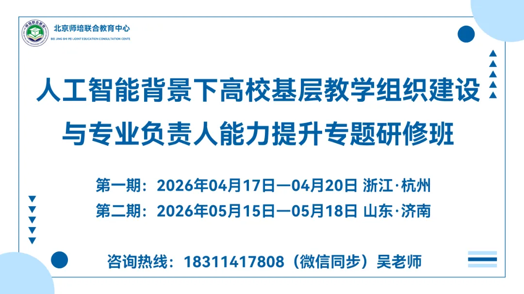 01.AI时代下教学督导工作创新、教学评价与质量保障体系建设专题研讨会(03月27日-桂林/04月17日-北京)02.智慧赋能课堂、创新引领教学:AI赋能智慧课程建设与课堂教学创新实践研修班(03月27日-杭州/04月24日-重庆)03.国家社科基金项目选题、申报策略与科研能力提升专题研修班(03月27日-西安/04月10日苏州)04.本科毕业论文(设计)质量保障暨指导教师能力提升专题研修班(03月27日-武汉)05.OBE理念下的人才培养方案研制与课程大纲的设计、编写及修订专题研修班(04月10日-济南/04月24日-昆明/05月15日-太原)06.智慧教育:人工智能赋能混合式教学与智慧课程建设专题研修班(04月10日-成都/04月17日- 南昌)07.人工智能背景下高校基层教学组织建设与专业负责人能力提升专题研修班(04月17日-杭州/05月15日-济南)08.赋能·增效:AI助力教学创新与课堂效能提升专题研修班(05月09日-兰州/05月29日-成都)09.人工智能赋能产教融合背景下高校实践教学与实习实训管理能力提升研修班(04月10日-重庆/04月24日-南京)10.AI赋能时代下高校实验室安全与实验教学创新专题研修班(04月17日-武汉/05月15日-苏州)11.高质量发展—数智赋能教学改革与教学成果奖全流程培育凝练申报培训班(04月24日-厦门/05月22日-大理)12.数智驱动 规范提质——新时代高校学籍学历管理创新与信息化能力提升(04月17日-重庆/05月15日-昆明)13.AI赋能新时代高校辅导员职业生涯规划与就业育人能力提升研修班(04月24日-成都/05月22日-北京)14.人工智能赋能新时代高校辅导员·班主任思政与心理健康教育综合素质提升研修班(04月10日-厦门/05月15日-济南)