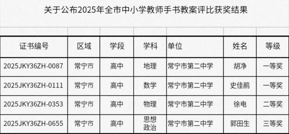在2025年衡阳市中小学教师手书教案大赛中,我校胡净、史佳鹃、徐电、郭田生四位教师精心设计的教案荣获市级奖项。特此向获奖教师表示祝贺!