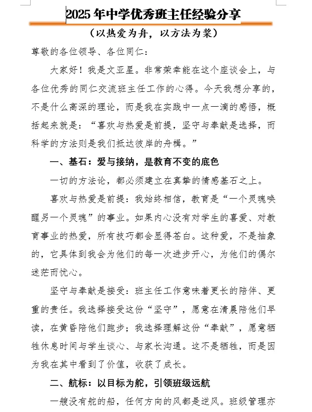 大家好!我是XX。很荣幸在这里分享我的班主任心得。如果用一句话概括,那就是:热爱是起点,方法是路径,成长是答案。