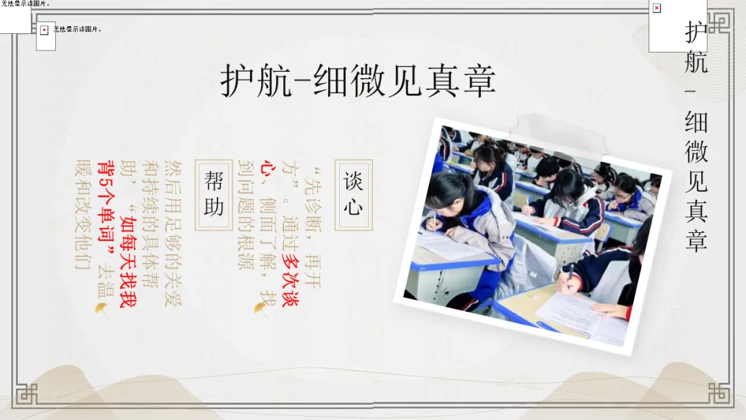 面对“问题学生”,我的原则是:先诊断,再开方。通过谈心、观察,找到问题根源,用持续的具体帮助(如每天找我背5个单词)去温暖他们。我允许学生犯错,因为犯错是最好的学习契机。