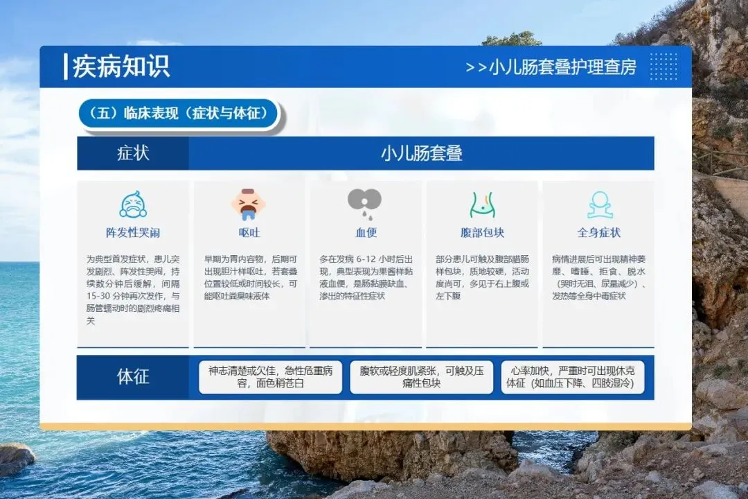 哭闹是首发症状,宝宝会突然剧烈哭闹,持续几分钟后缓解,过十几分钟又开始,这是因为肠道蠕动牵拉套叠部位引起剧痛。呕吐早期是胃内容物,后期可能吐出黄绿色胆汁样液体。血便多在发病6到12小时后出现,典型的是果酱样黏液血便。部分宝宝腹部还能摸到腊肠样的包块。