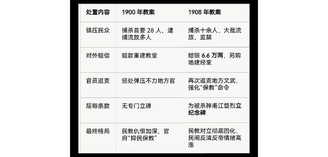 两次南康教案相隔八年,冲突不断升级,并非偶然事件,而是多重矛盾长期积累的结果。在经济方面,教会侵占田产,教民恃强凌弱,夺牛、霸产、赖债等行为直接侵害民众基本生计,在农耕社会极易引发激烈反抗。在司法方面,领事裁判权使教会超越地方法律,教士干预诉讼,官府屈从外力,司法不公使民间矛盾无法正常化解。在文化方面,洋教冲击宗族礼仪与民间信仰,育婴堂谣言加剧文化恐慌,使民众将教会视为异类与威胁。在政治方面,清廷一味媚外压内,丧失民心,使地方社会对朝廷的信任逐步瓦解。因此南康教案本质上是传统内陆乡土社会面对外来势力入侵,在生存权益、司法秩序与文化信仰全面受压下的激烈反抗。