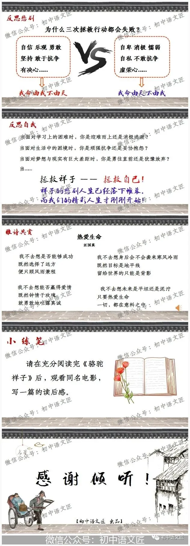 声明:本篇文章为回顾文章,文章内含原创课件已于首发当天上传初中语文匠三阶系列课,回顾时不会再次上传至其它任一【阶段系列课】,以免造成【阶段系列课】之间资源的重复!