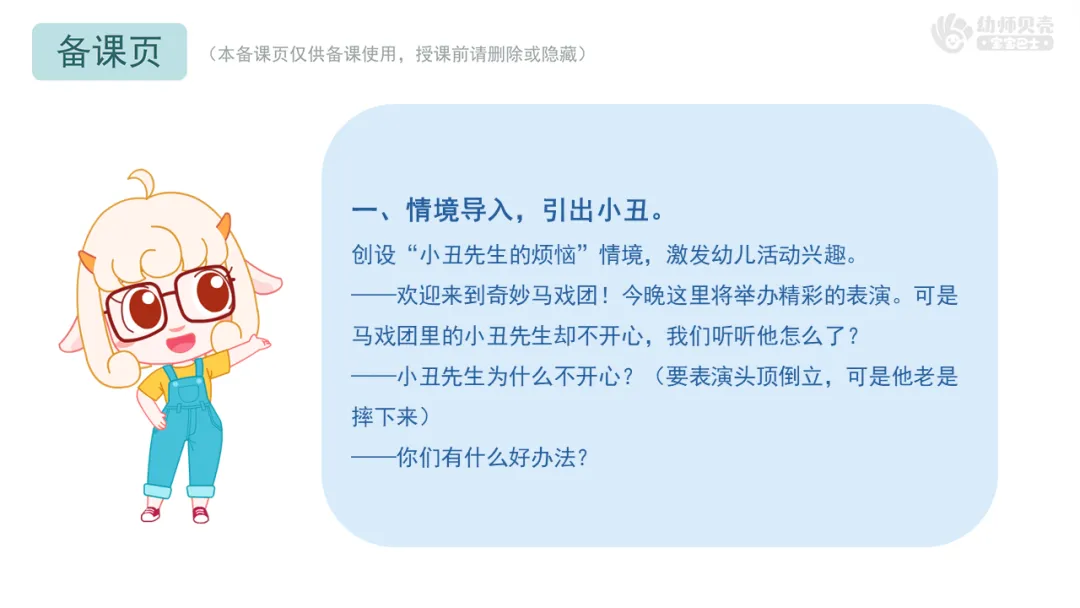1)情境创设法:以“小丑的表演困境”为导入和主线,利用生动的PPT插画、教师语言渲染,营造充满趣味的马戏团氛围,激发幼儿参与热情。