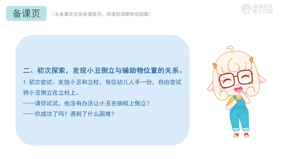 1.初次尝试:发放小丑和立柱,每位幼儿人手一份,自由尝试将小丑倒立在立柱上。