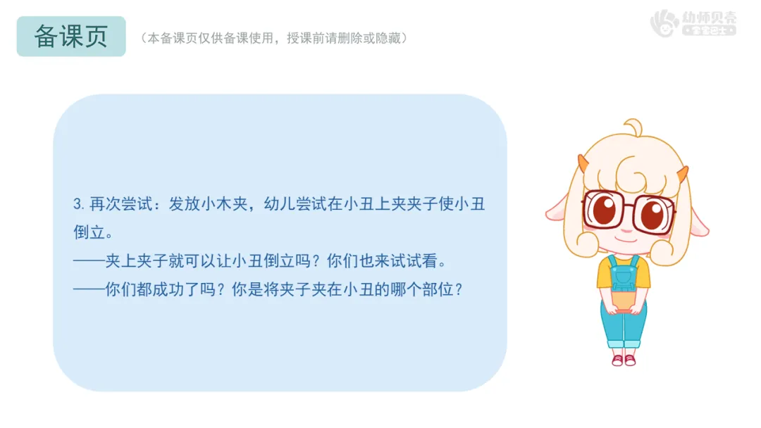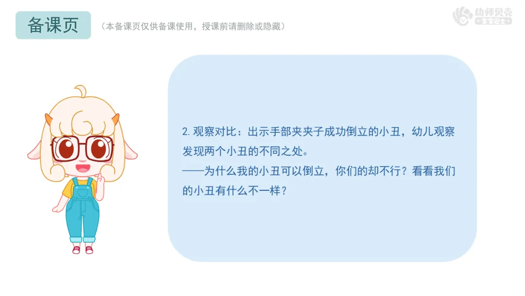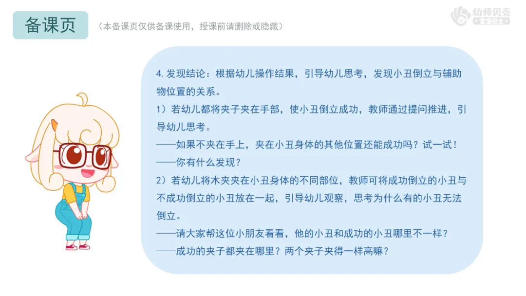 3)比较发现法:在教师引导下,幼儿通过对比成功与失败的小丑(夹子位置高低、不同材料效果、单个与多个回形针效果),发现规律。
